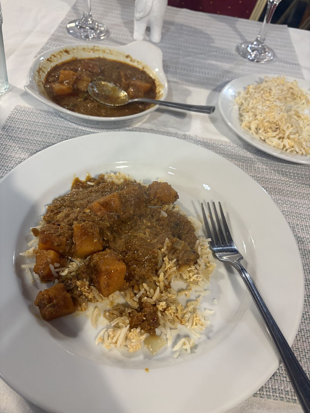 Vegetable rolls and sambar curry with rice
