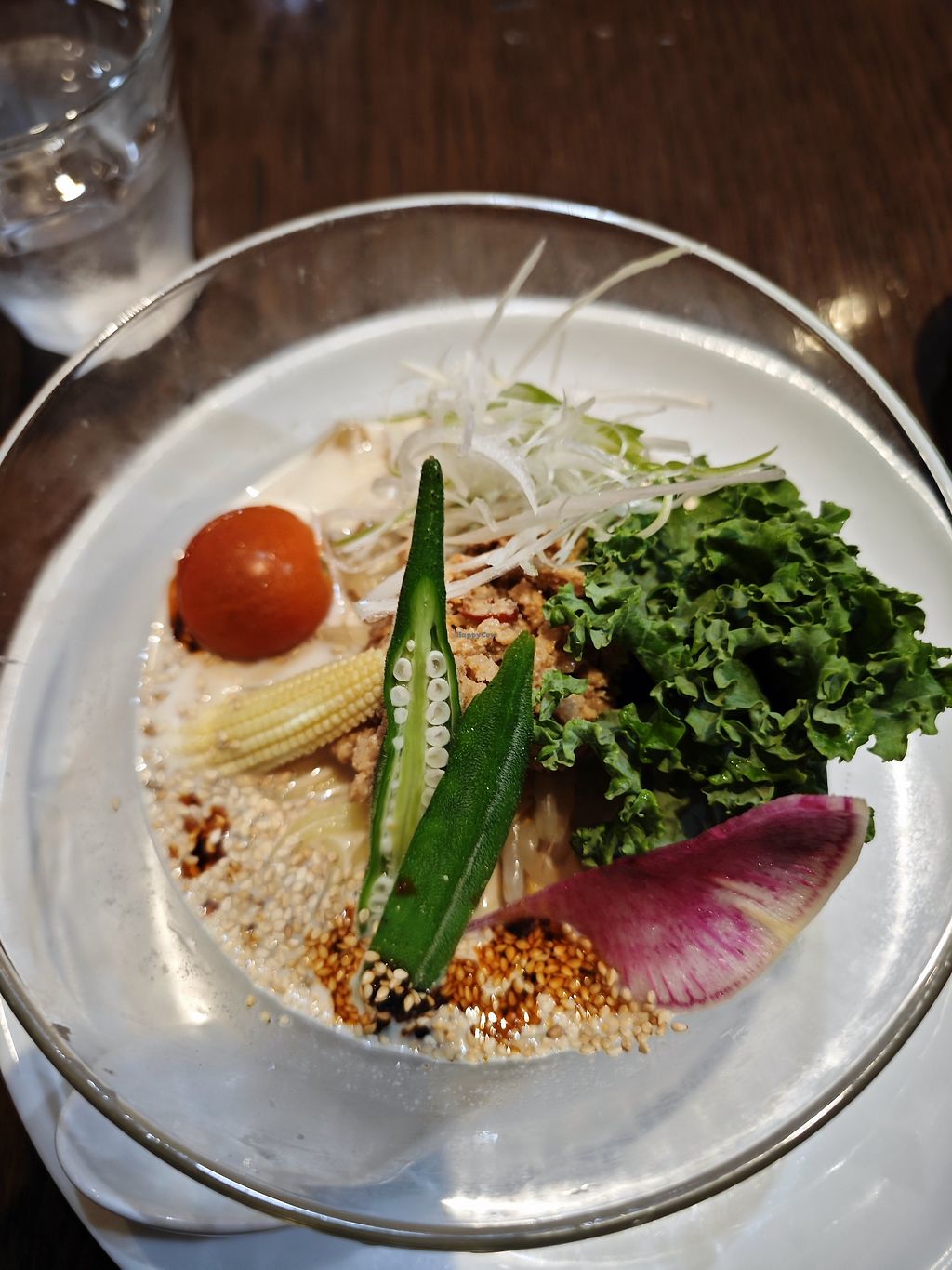 I ordered a vegan salad, vegan masaman curry with fried soy meat, spring rolls, and blueberry soda. The nuanced tangy spicy flavor of the soy meat, the vegan dressing and salad with almond, walnut, and macadamia, and soda served with a layer of blueberries brought with them intensely satisfying flavors. The staff were all nice and able to accommodate English speakers.