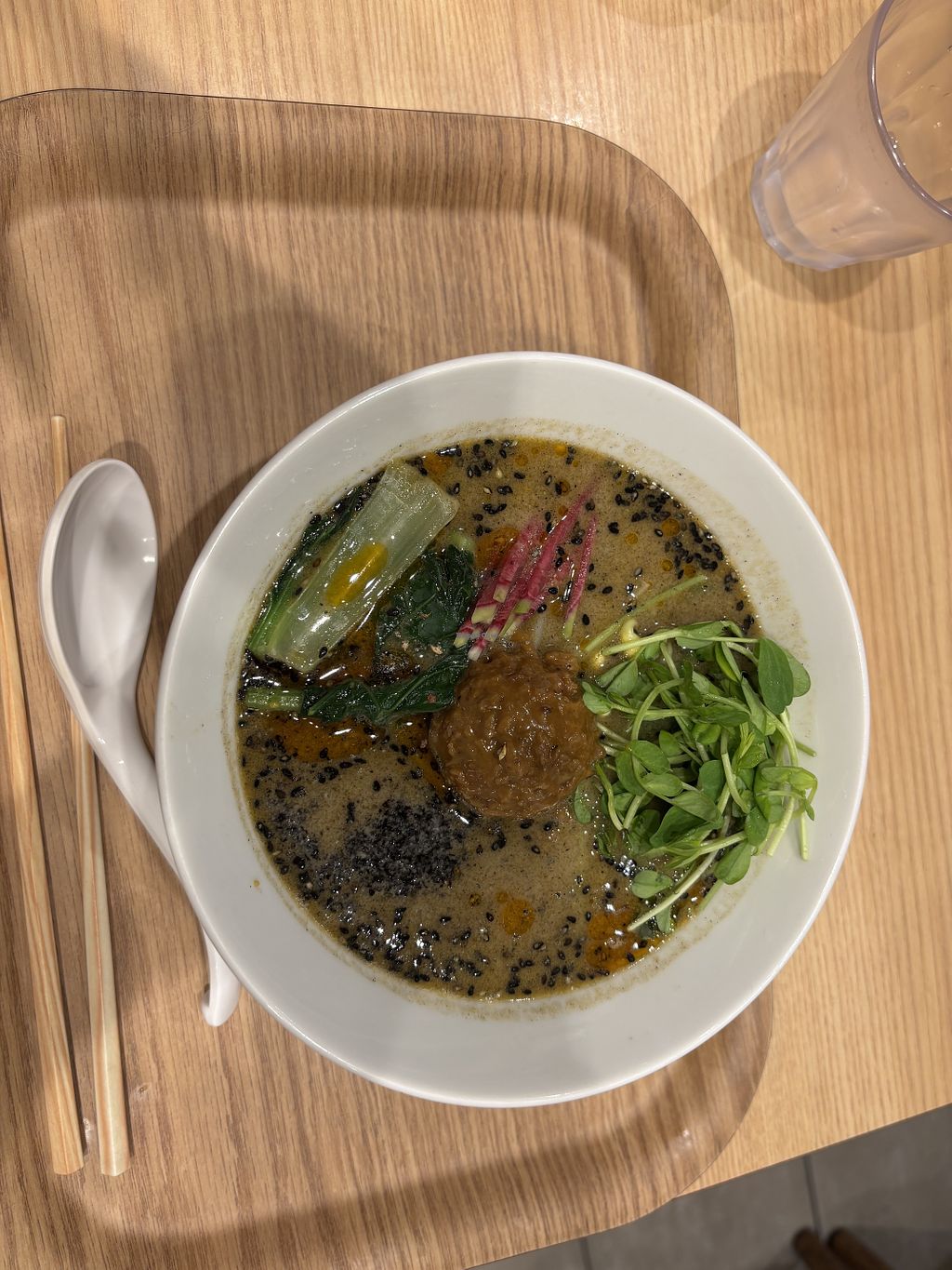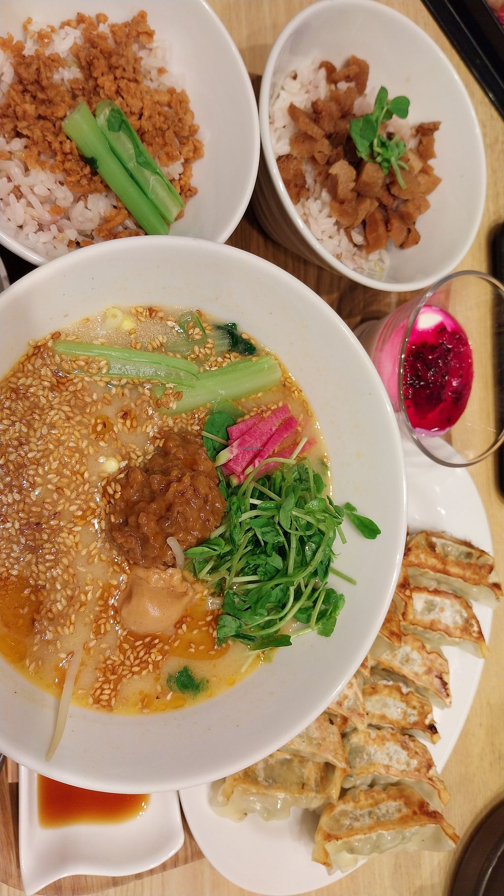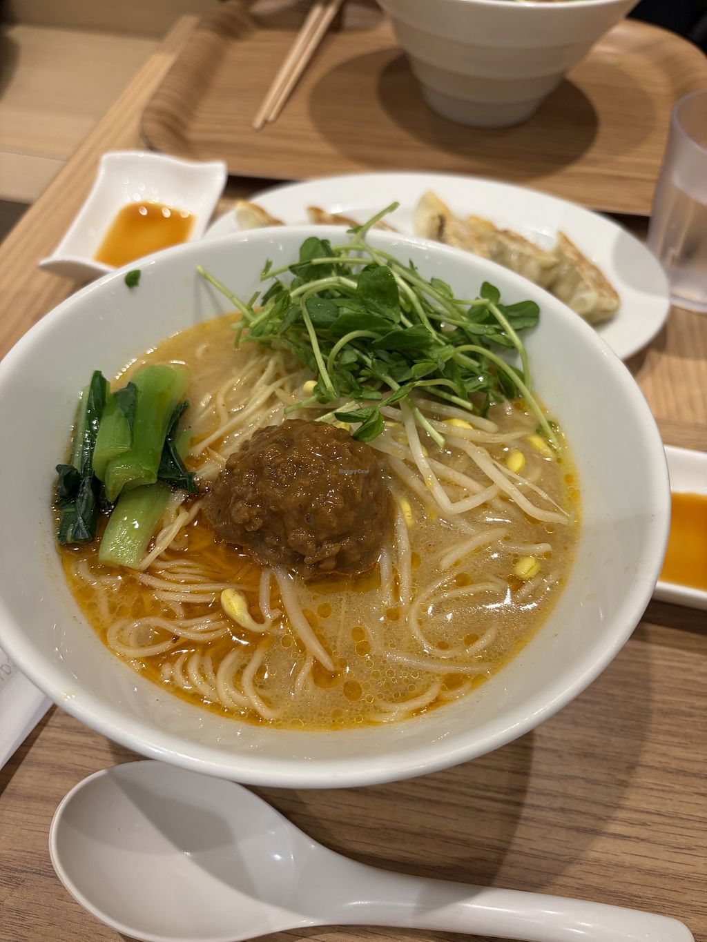 We couldn’t tell from the outside but there’s actually quite a lot of seating at this restaurant so the queue to get in went by quite fast. Tried 2 different ramen: golden and black sesame. Both were delicious but we both preferred the golden. Great toppings especially the vegan cheese! Also got gyoza which were delicious too.