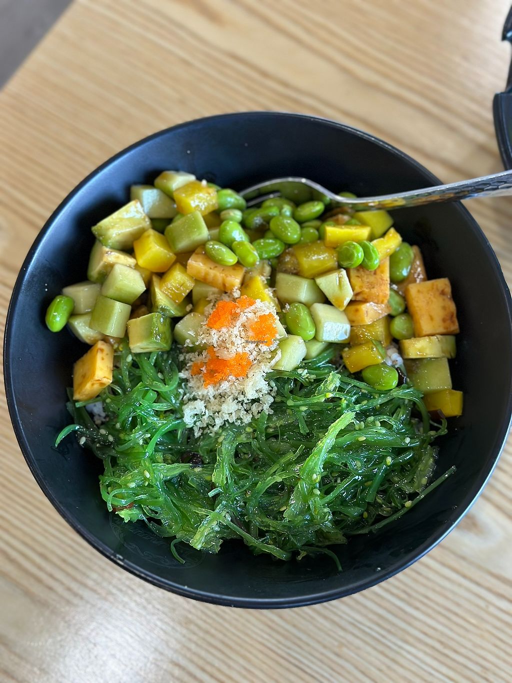 Vegetable Poke Bowl- edamame, avocado, cucumber, Oshinko, tomato, seaweed salad, green onion. We loved this dish.
