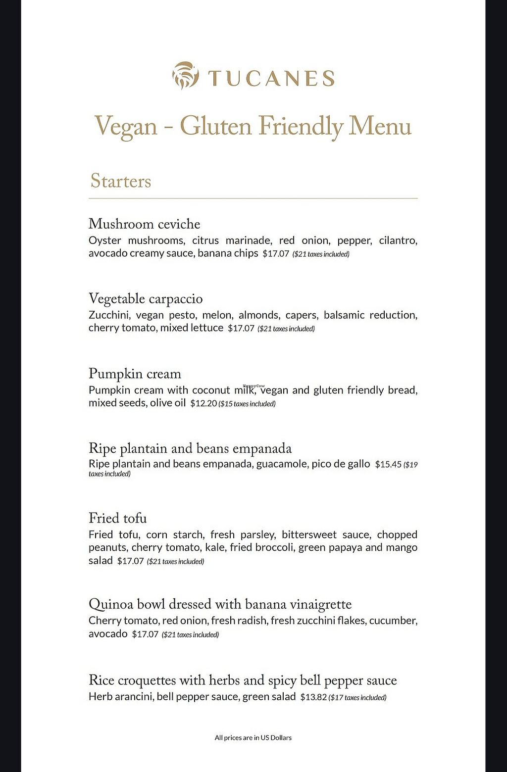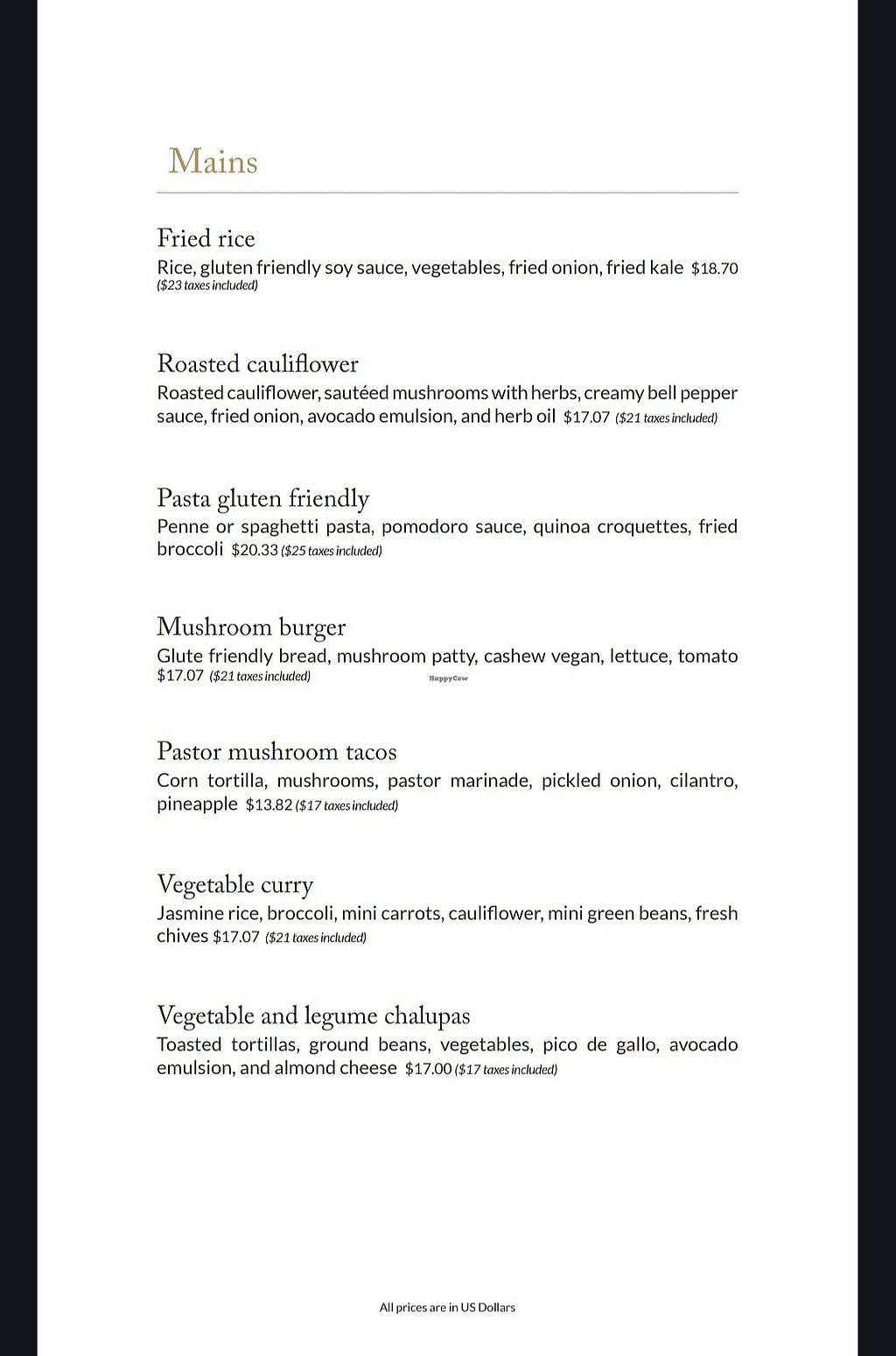 Numerous high quality vegan entrees. When asked, they provide a separate iPad menu with specific dietary choices. I had the best mushroom burgers I ever had, on a gf bun. Not just a mushroom slapped on bread, this was a delicacy. The plantain black bean empanadas were worthy of an award! As was our server Jafeth.