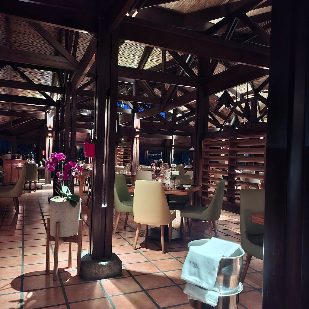 🌺 Le cadre est très joli, avec vue sur les jardins et la piscine. L'ambiance est tamisée.
