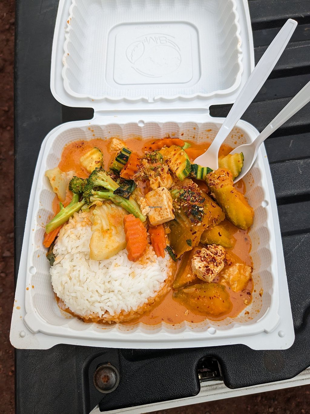Read moreIn short, I’d say call in advance because they were out of about half the menu (fair enough, they’re a food truck that operates almost all day). My first choice of curry was out of stock but my second choice was there, and it was delicious! My partner wanted pad Thai, but they were out and the guy recommended I get her sweet and sour stir fry instead. Doesn’t sound like pad Thai to me…. But hey, they know their menu better than me so why not? Anyhow, the stir fry was really bad. So much sweet and sour sauce. It was a nightmare to dispose of because of how much it was leaking. I ended up getting some summer rolls for myself (good) and some spring rolls for her (kinda smashed and messy). Additionally, be warned, the spring rolls are not vegan according to the guy working there (they use egg).