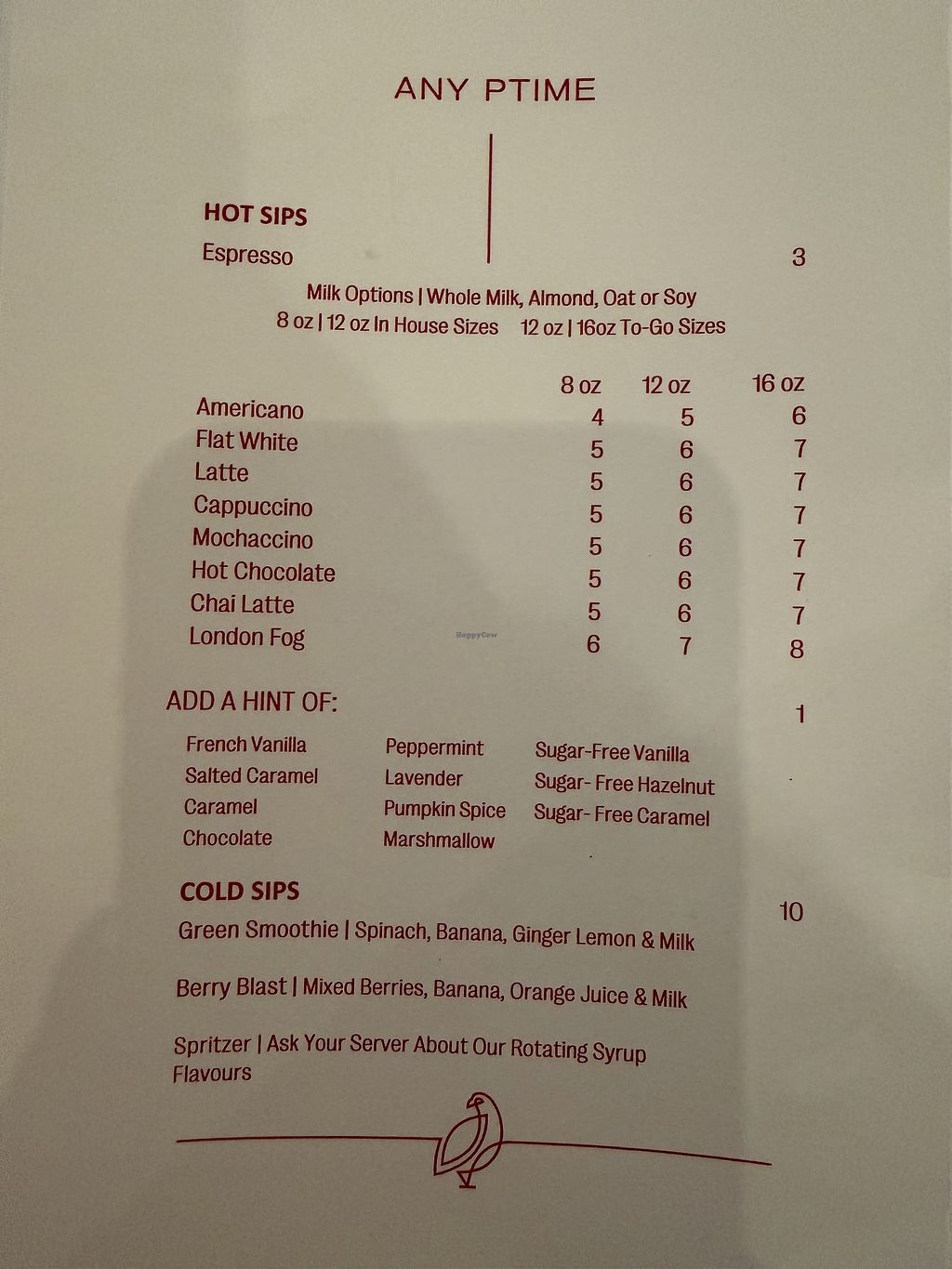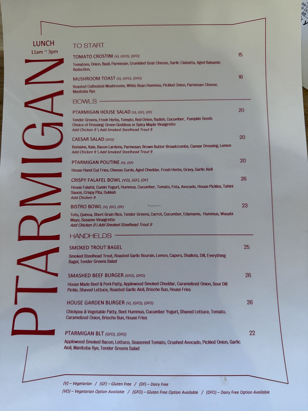 Menu from sister restaurant across the street (Ptarmigan)