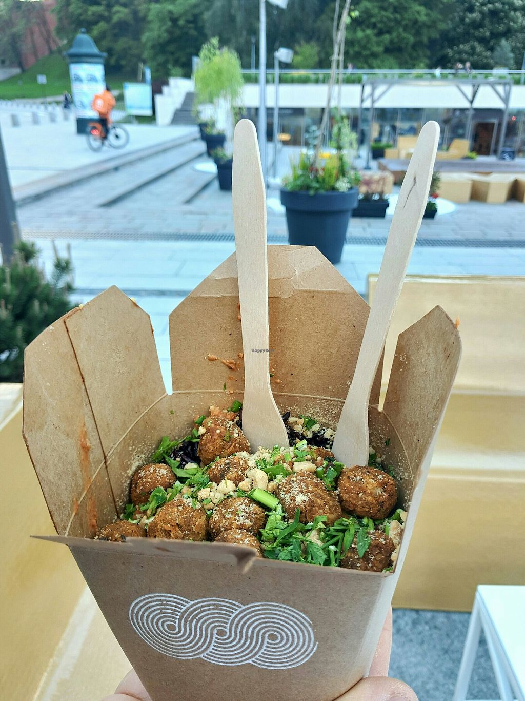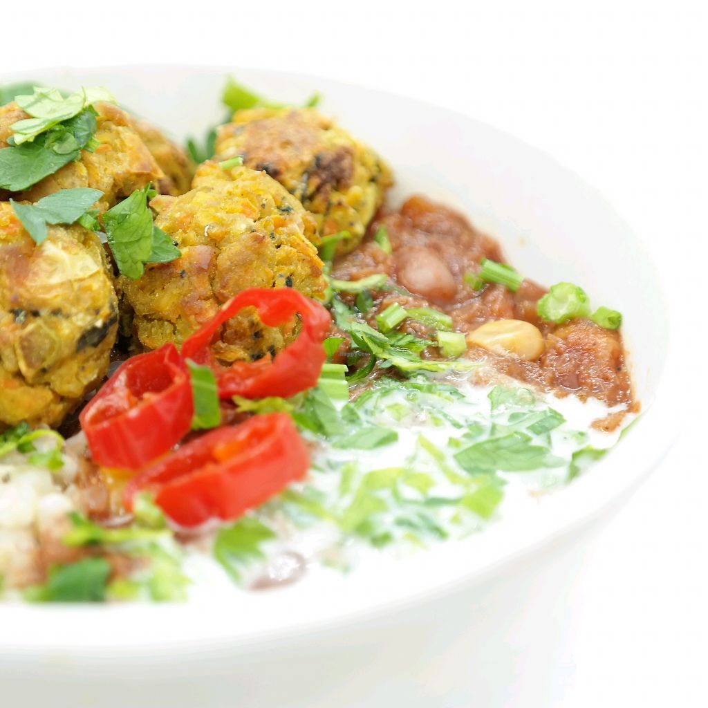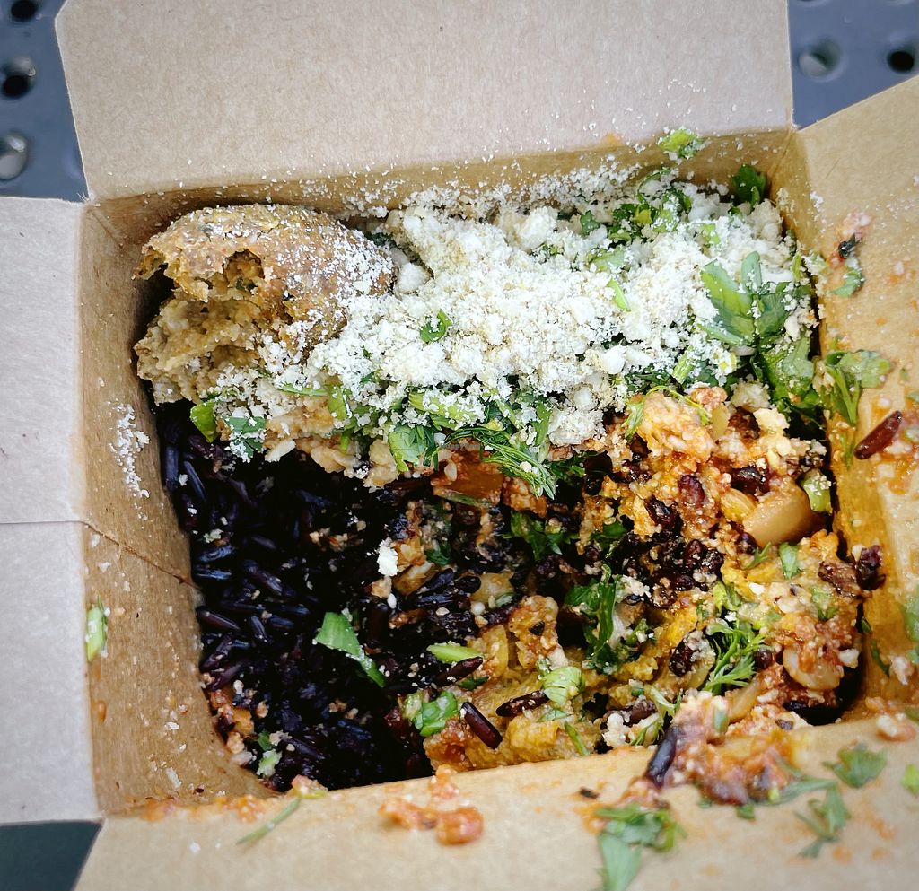 Lentils, black rice, mixed sweet potato and green balls, several toppi…