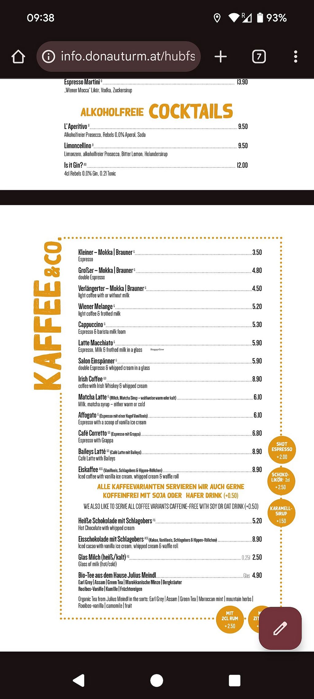 Serves meat, vegan options available. A rotating restaurant offering a 360° panoramic view of Vienna from a height of 170 meters. Vegan options include almond nougat cake and coffees with soya milk. Provides meals, snacks, desserts, and hot and cold drinks. Open Mon 17:30-22:00, Wed 11:30-04:00, Thu-Sun 17:30-22:00. Closed Mon & Tue.
