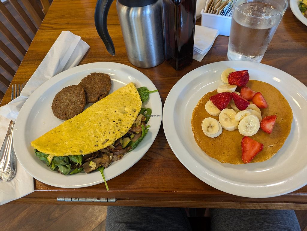 Serves meat, vegan options available. Casual brunch-focused American chain restaurant with Just Egg and Beyond sausage substitutions. Offers vegan pancakes, avocado toast, omelets and more. Limited choices available for lunch. Reservations encouraged. Open Mon-Sun 7:30am-3:00pm.