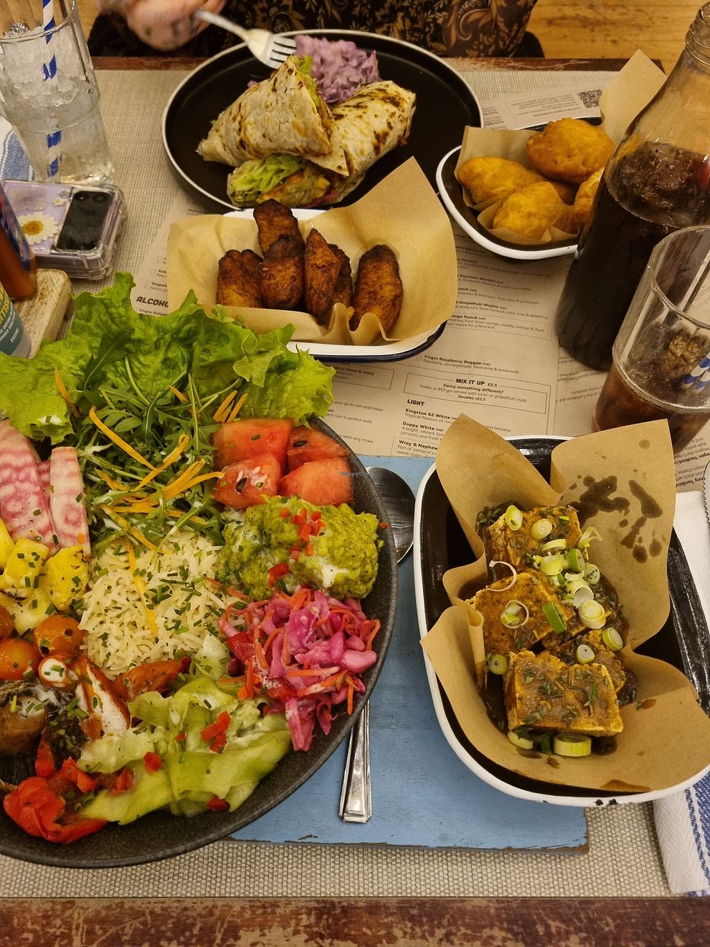 clearly labelled selection of vegan meals and sides, including burgers, chicken roti, salads, a buddha bowl, curry and a wrap. i went here for bottomless brunch, which was fantastic value. all (bar 1) cocktails were vegan on the bottomless brunch menu, and are clearly marked on the menu which is rare for any alcohol menu usually. the service was quick and friendly also.