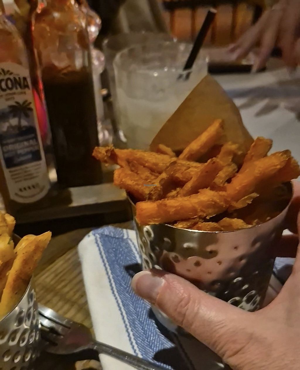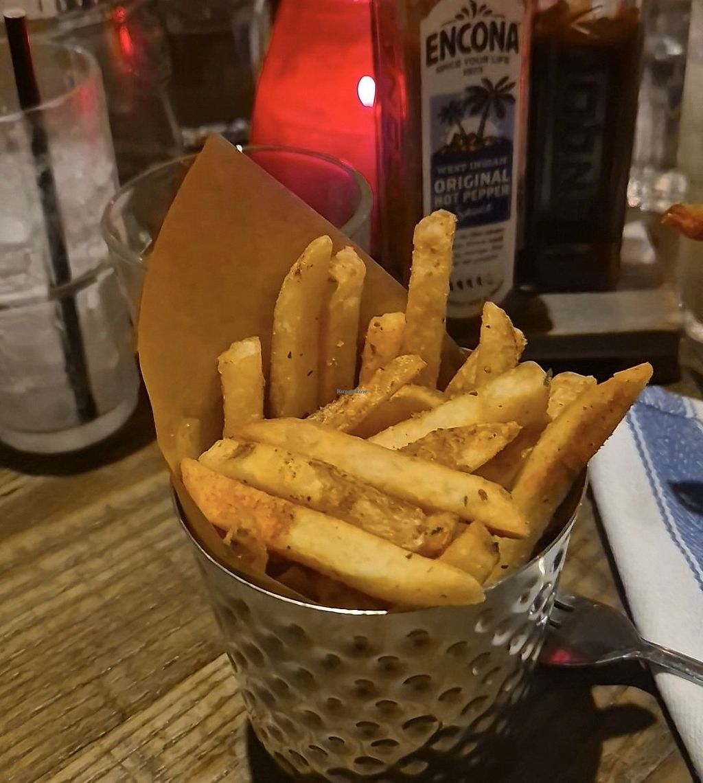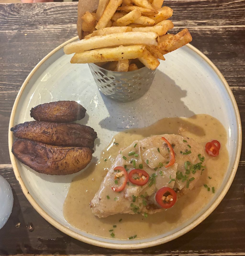Really vibey restaurant, great music and stylish interior. I opted for a turtle slay vegan cocktail and a main dish of vegan jerk chicken in gravy, pineapple and fries with a side of plantain and vegan coldslaw. Great bold fruity flavours and spicy too. Really delicious.