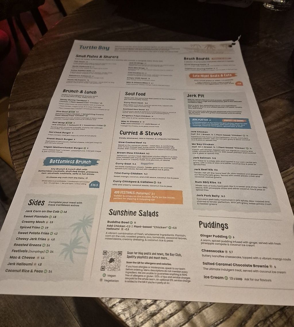 We called into Turtle Bay purely by chance. Saw a 2-4-1 in cocktails sign and thought we'd gave it a try. Was very pleasantly surprised to see the drinks menu clearly showed which drinks are vegan. They do food too but we didn't eat anything and never saw the menu. We tried the strawberry daiquiri & the rum runner. Service was swift & prices were great at 2-4-1.