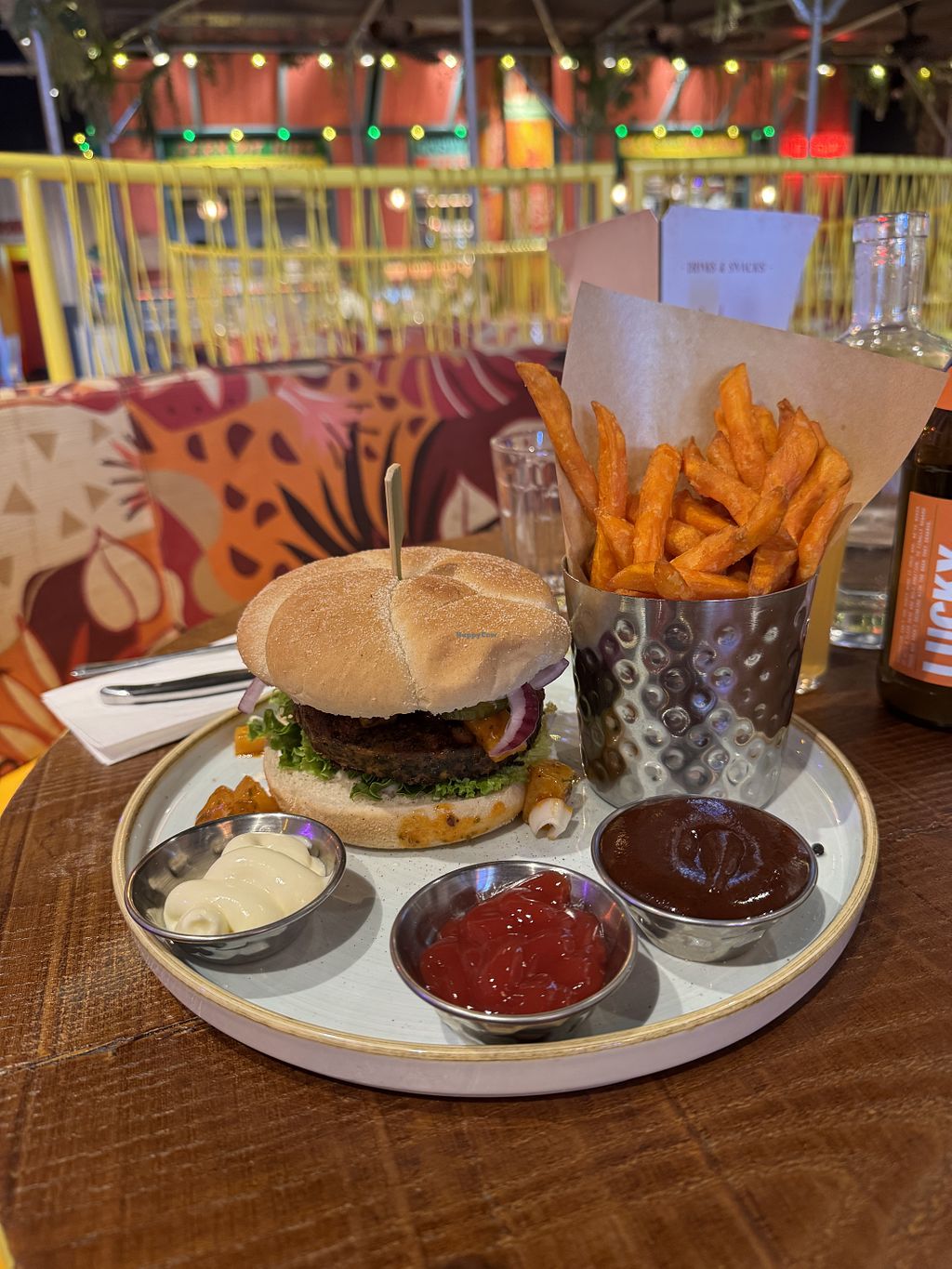 Vegan Motherclucker Burger with a side of fries & slaw 😍