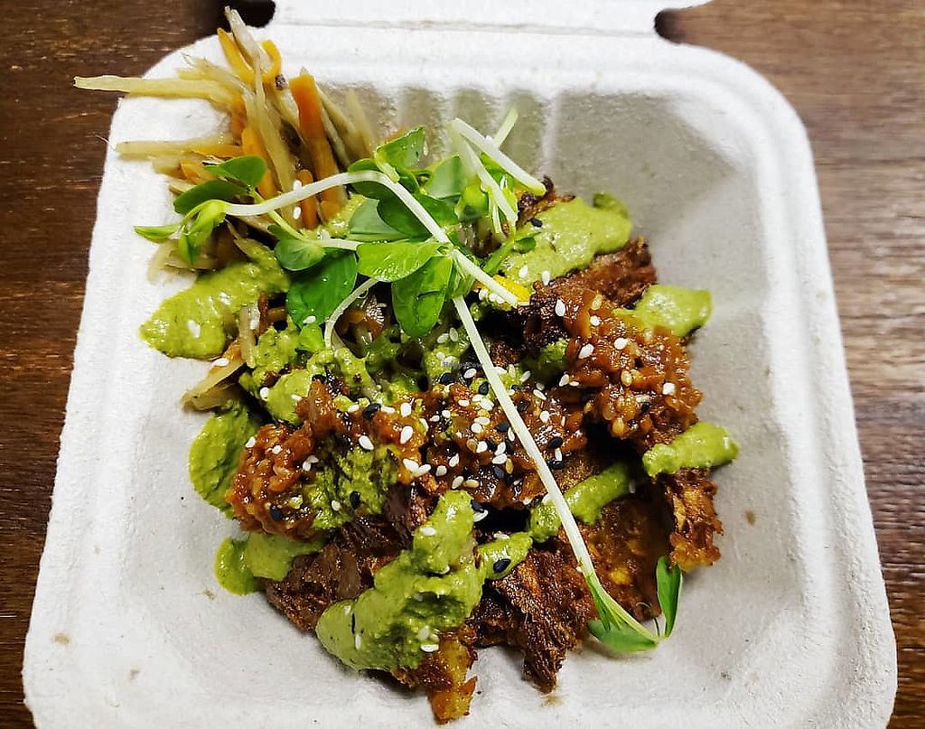 The food (Chicken made from Cauliflower) was really, really delicious and the staff was friendly! However, they sell everything in plant based “plastic”. Even tough it is recyclable (and so on), real cutlery and dishes would be more suitable for the food and more comfortable to eat with and better for the planet. Outdoor seating. It is great to watch the people going by on Kensington Market, but they should really clean up all the trash around the tables (everything from old socks to boxes and wood - that’s really not nice at all) and clean the tables every now and then... (no dishes/rubbish and dirty tables are max. three stars but the food makes up for it)