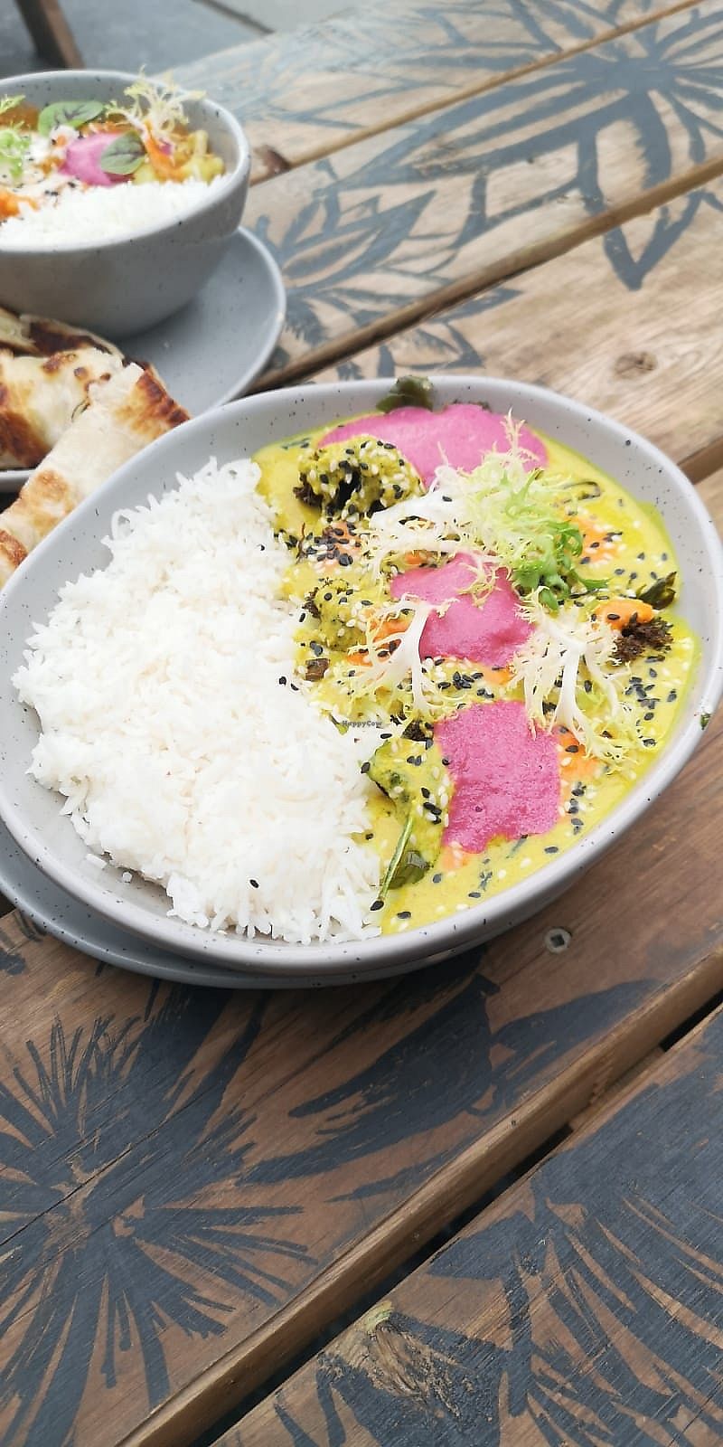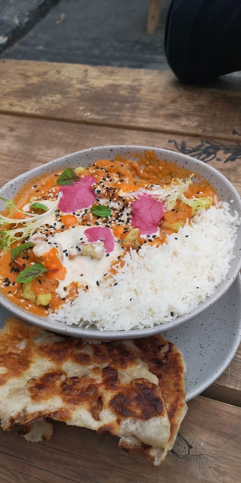 Real freshly made curry making no concessions on the spicy experience. Flavours and textures are on point. I had the no butter no chicken curry made with cauliflower in a « very hot » version. Regular size was perfect as it comes with rice and paratha. Terrasse at the back is welcoming.