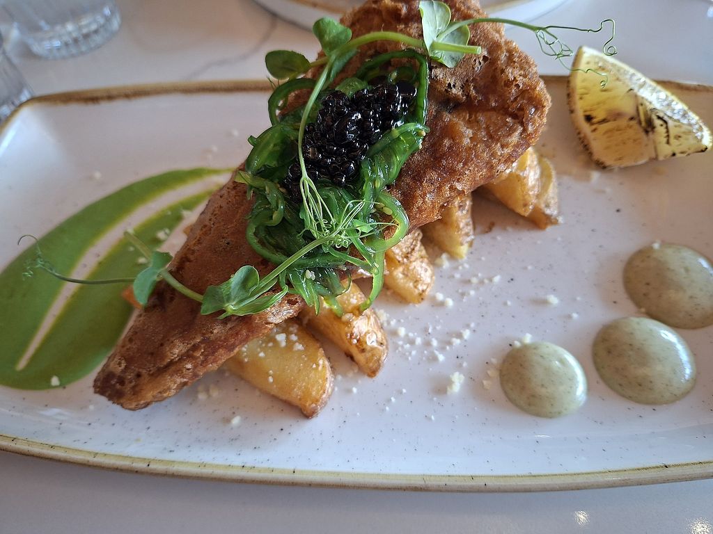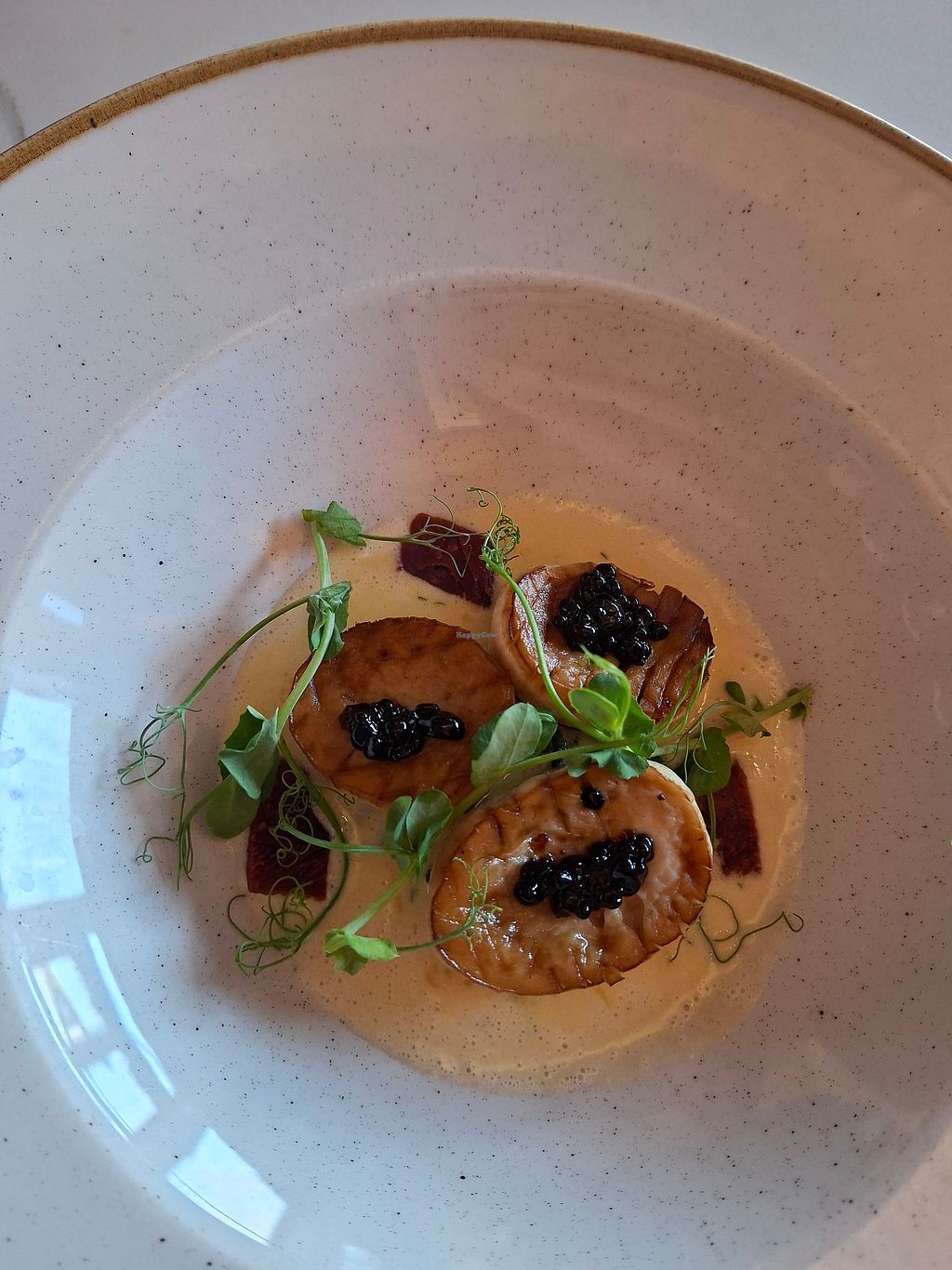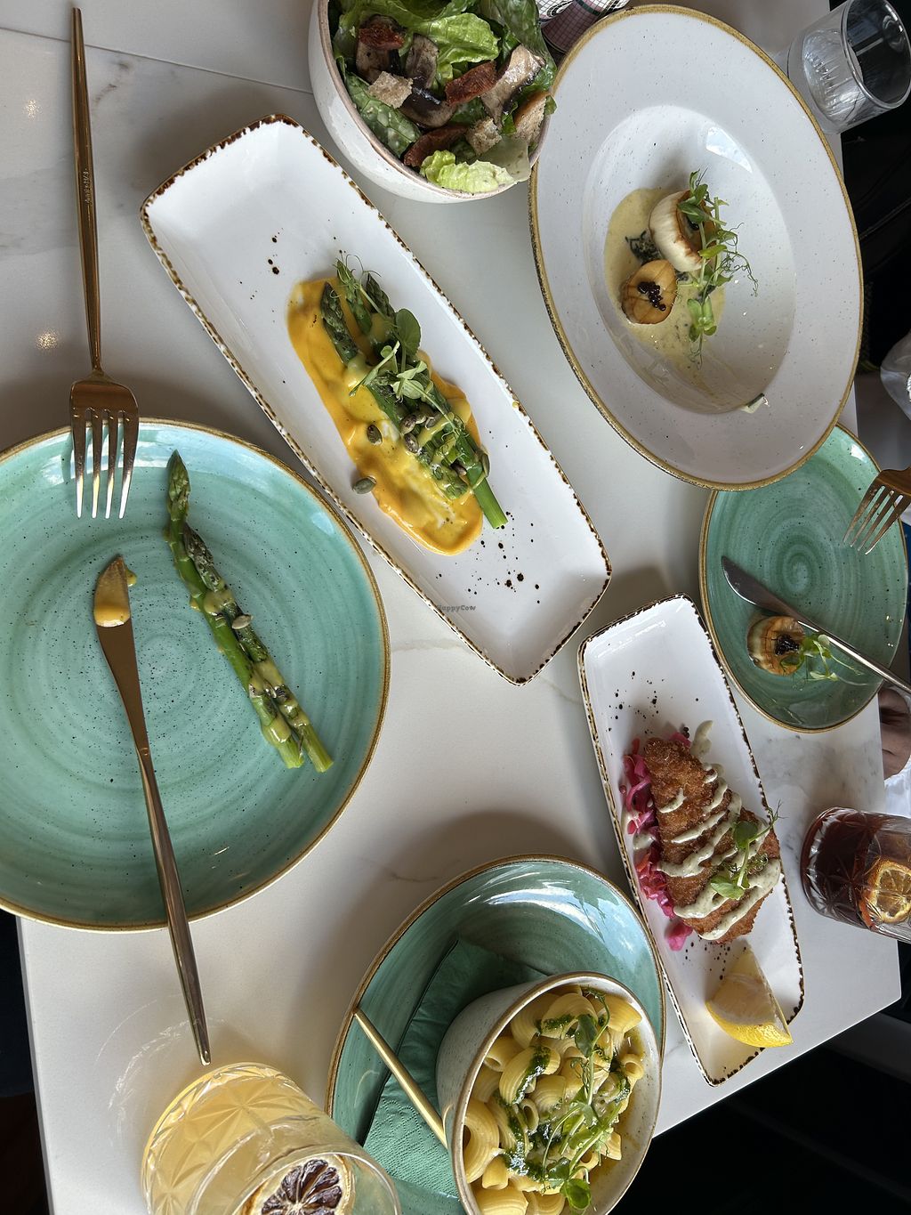 Caeser salad, oyster mushroom scallops, asparagus, macaroni cheese, sc…