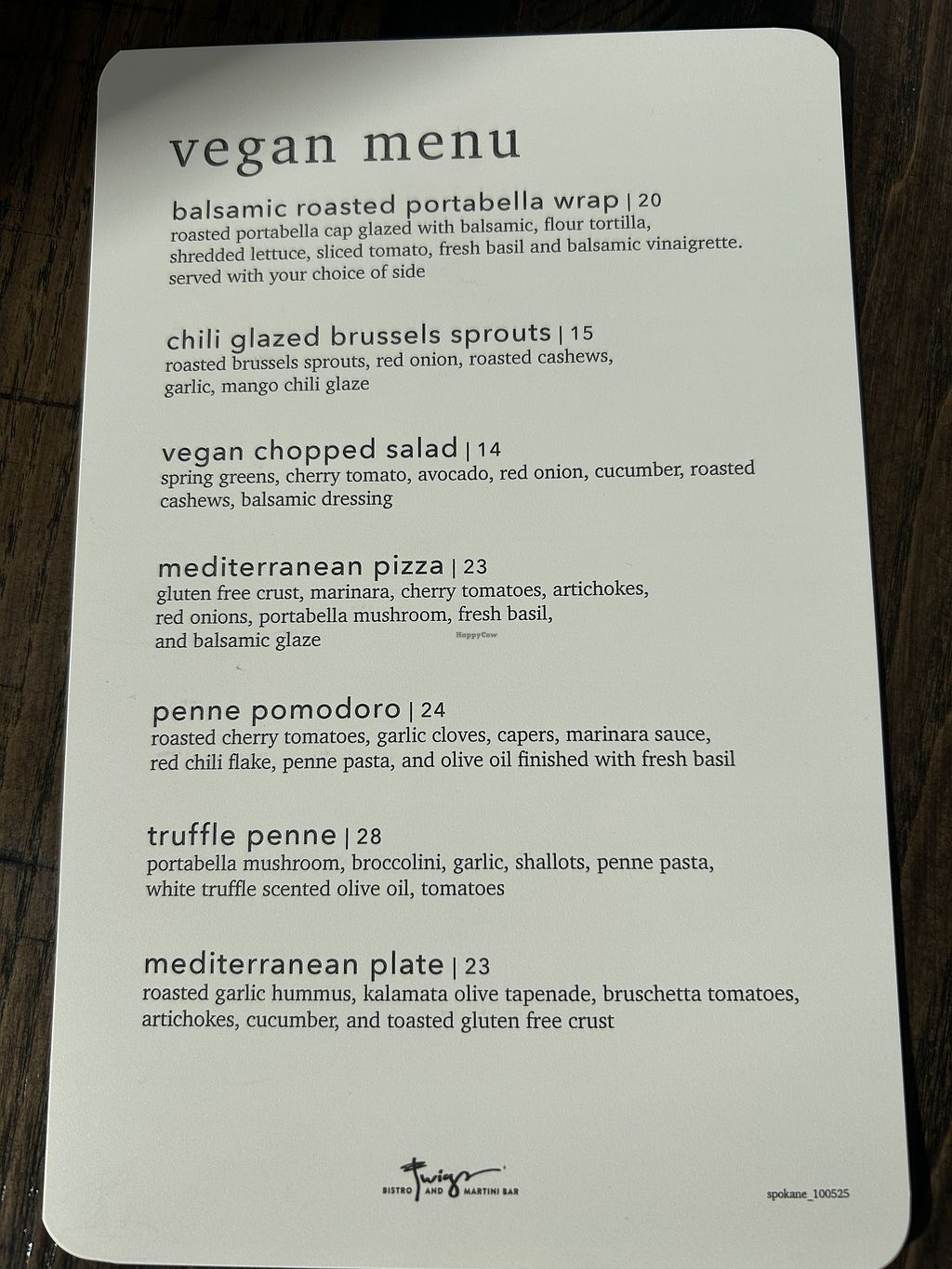 Delicious separate vegan menu. The Brussels sprouts with spicy mango sauce and cashews was GREAT and so was the pasta with red sauce and fresh basil. So nice to see a separate vegan menu and clearly marked items. The ambiance is nice, too, although inside a shopping mall. The server was very friendly and helpful. Highly recommended!