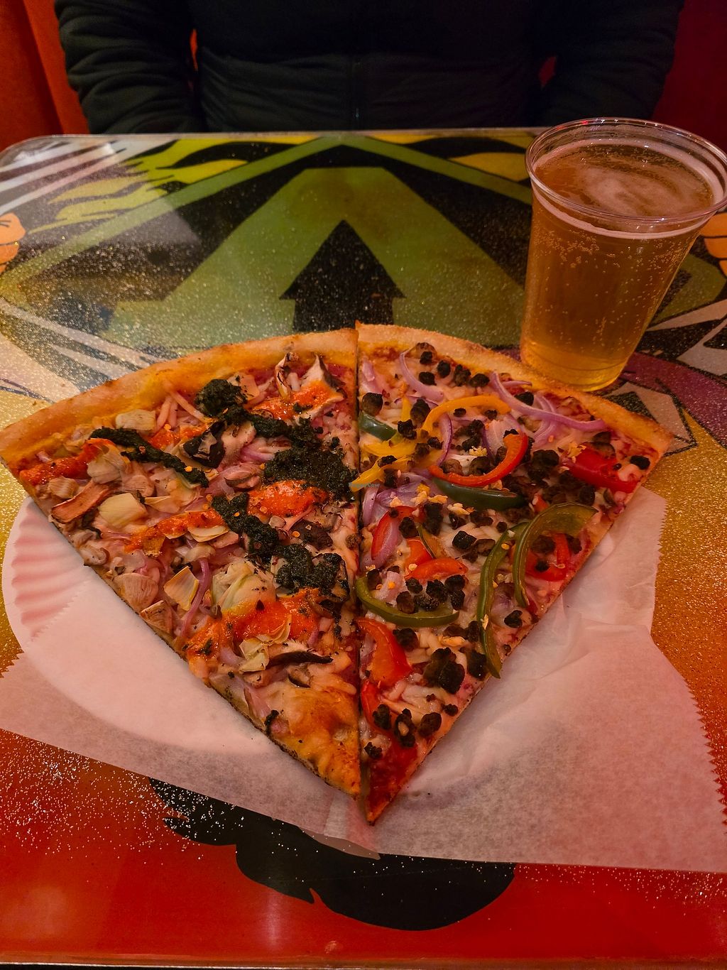 My wife and I shared 4 slices of the V is for Vegan pizza, and it was great. Well priced, MASSIVE slices, really good balance of toppings, and yummy vegan cheese. So great to see places like this serving vegan options. It is also a really cool spot with nice, weird, funky design and feel.