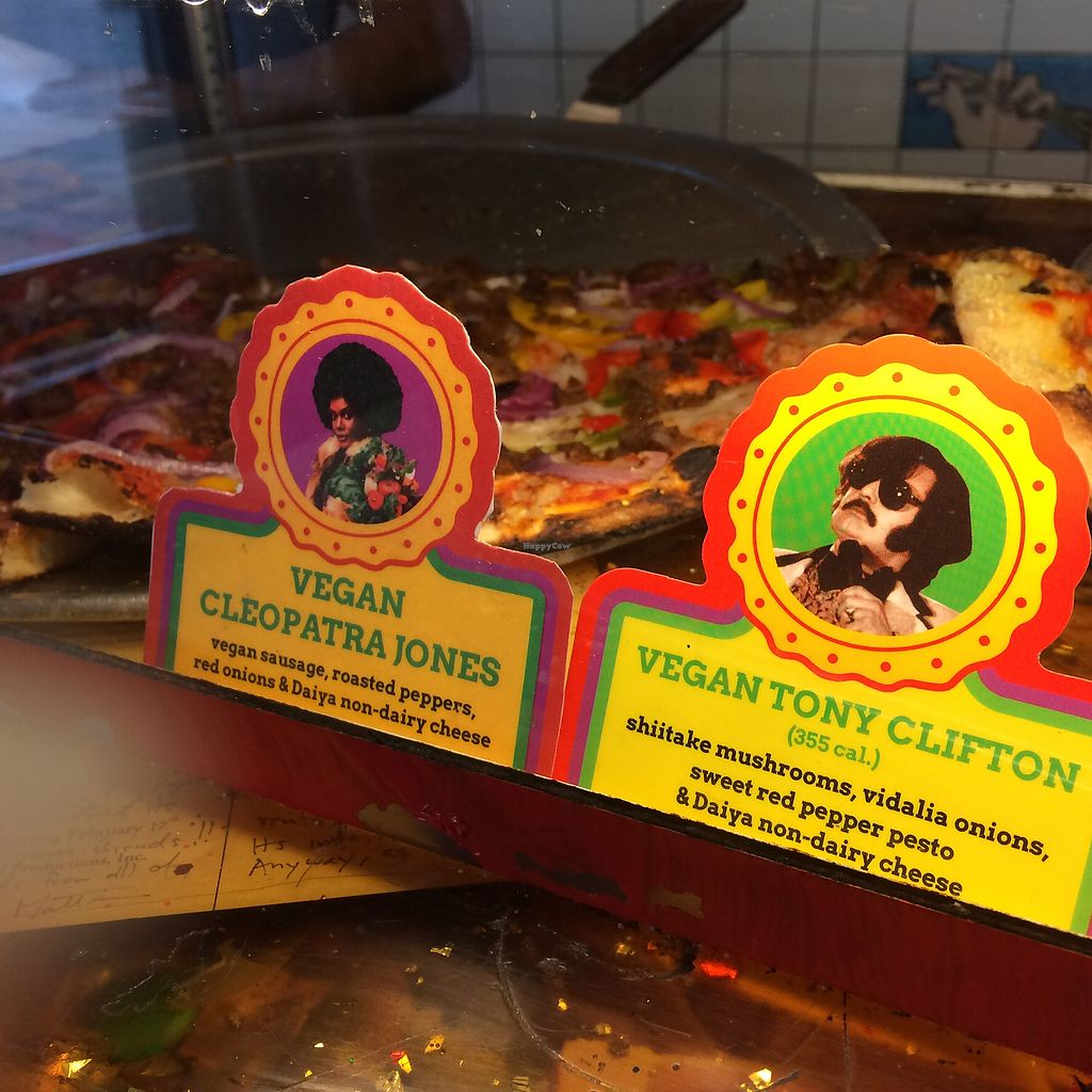 The V for Vegan pizza is so delicious! It has a drizzle of a red pepper sauce over the vegan cheese, artichokes, and a tasty pesto drizzle as well. I usually go to the east village location.