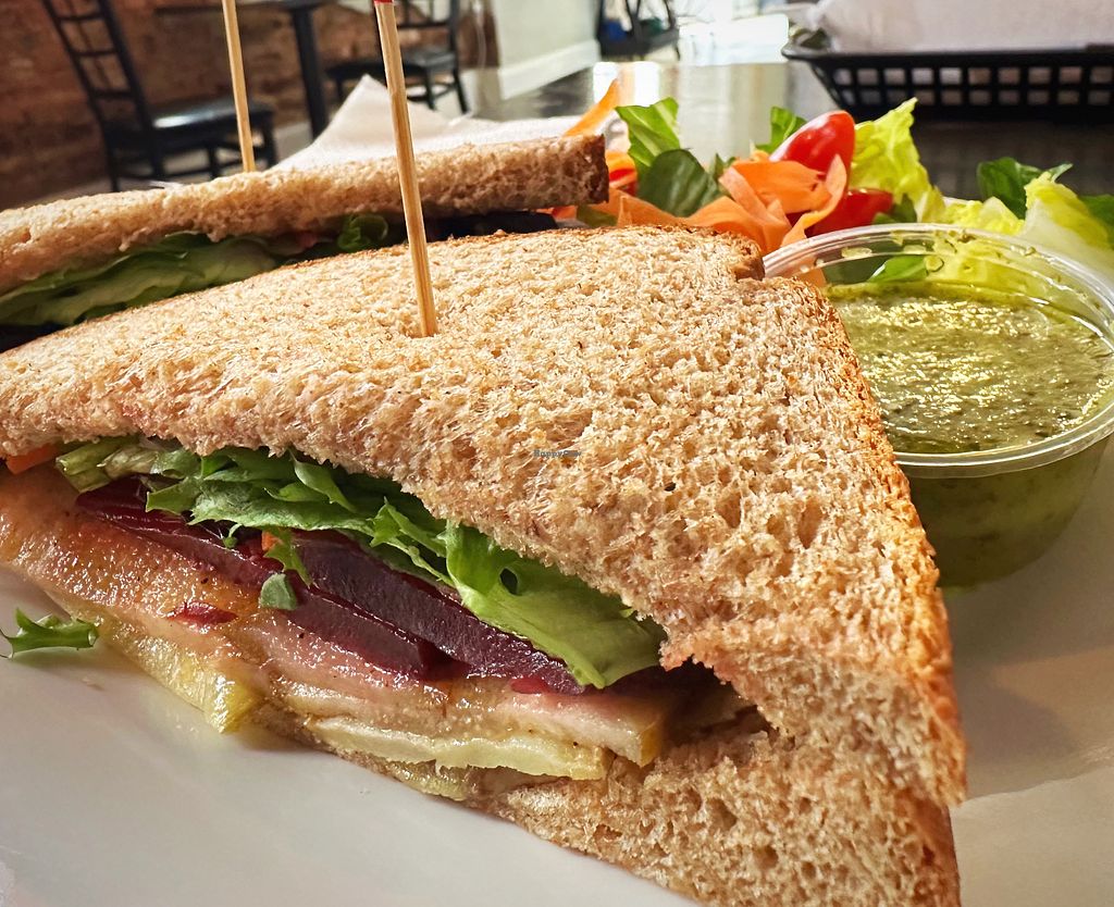 There aren’t many vegan options in Concord, NC, so I was thrilled to find this place. I am obsessed with their Veggie Delight sandwich. It is a perfect combination of greens, beets, potato, and other veggies on wholegrain bread. You have to hold the cheese and the sauce, but they recommend substituting with the cilantro lime dressing (this does contain honey). My husband loved their house made veggie burger and waffle cut sweet potato fries. If you are in concord, please support this charming spot!