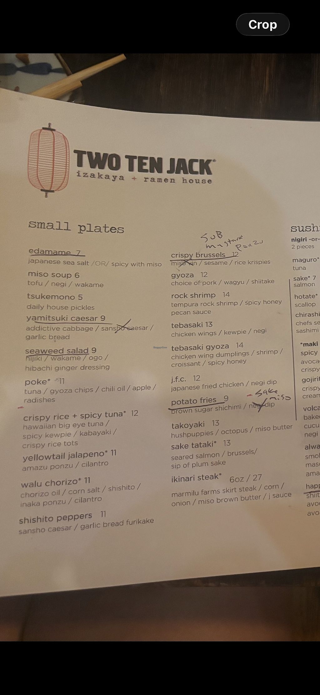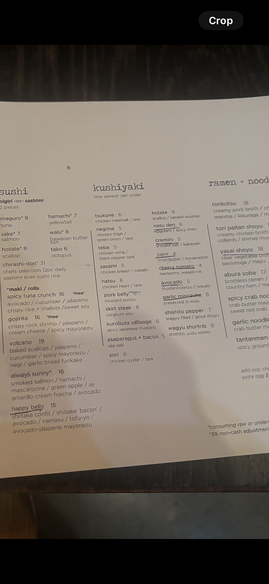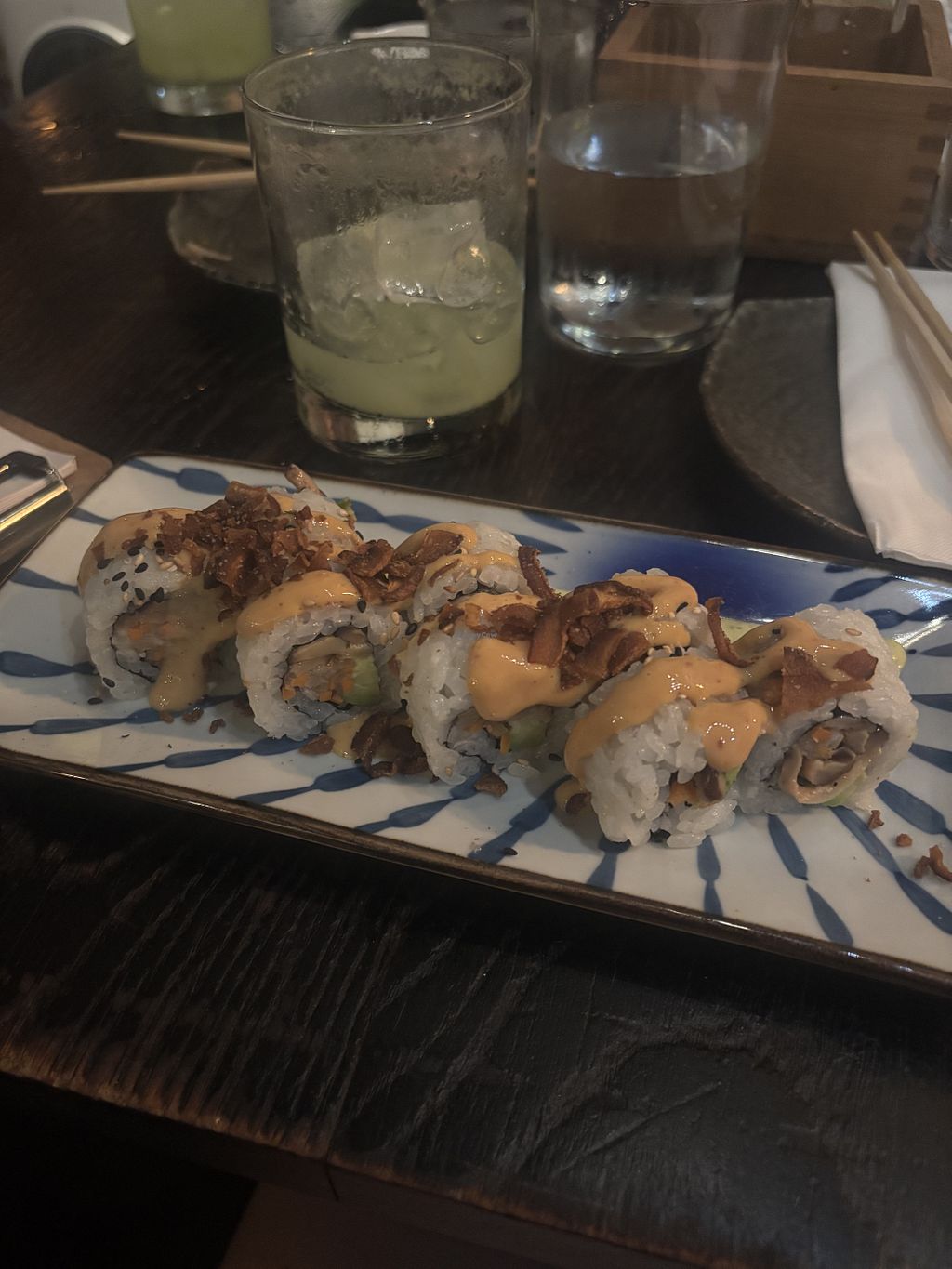 The menu does not list what is vegan, but when I asked our server he told me what he knew was vegan but then took the menu back to the kitchen to underline what all was vegan. Which was so nice, but I wish they would permanently mark it on the menu. As for the food I got the Happy Belly sushi roll and the avocado kushiyaki. Both were absolutely delicious