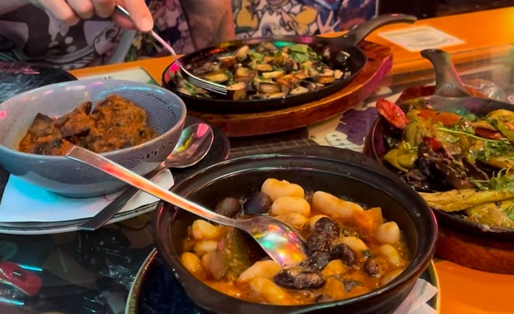 The vegan options I had were: beans in clay pan, eggplant and tomato (cold), and grilled mushrooms. I also ordered flatbread (which was fresh and warm and honestly so good!). I really liked the beans, very flavorful! The place is also very fun and the staff was very friendly and spoke English. My friend got some gluten free bread even!