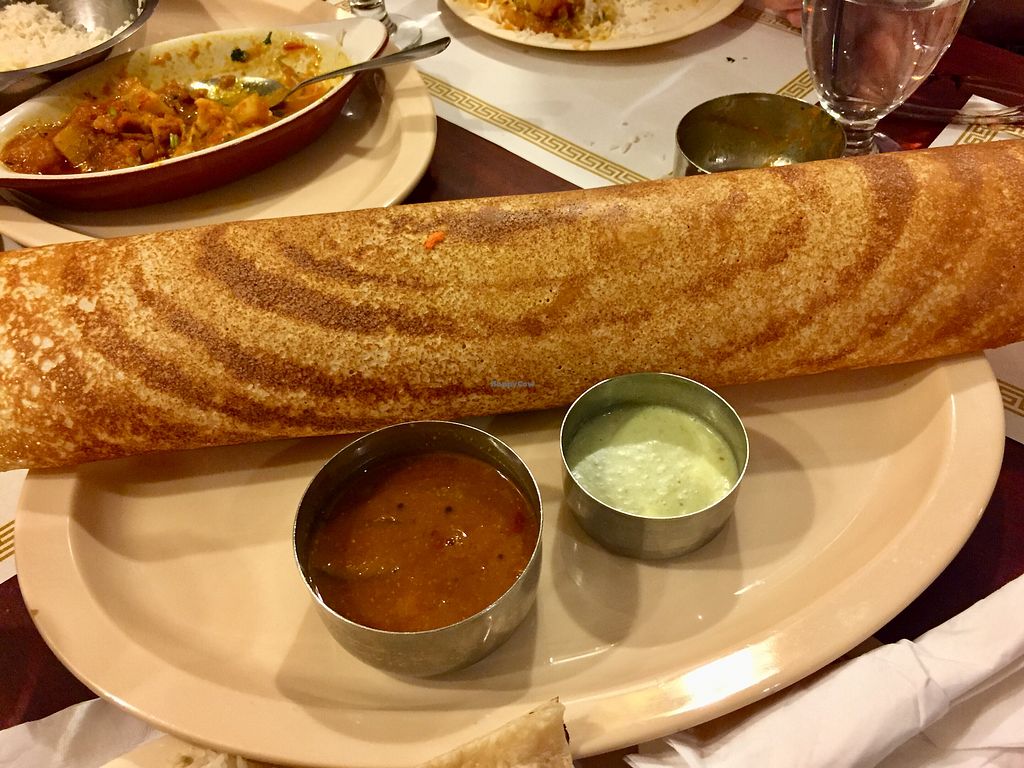 Options for all vegetarian or all vegan restaurants are very limited in the Cleveland area but fortunately there's Udupi Dosa. We wanted all vegan dishes and needed the help of our server because the menu doesn't signify what's vegan. He was super helpful and took a lot of time explaining the very extensive menu and made some very good recommendations: The aloo gobi curry dish was our favorite and apparently the only curry dish without dairy. The udupi special spring dosa was filled with potato and onions and was also very tasty. The masala dosa is quite a site--it's a huge pancake that overflows on the plate and is partially filled with a similar potato and onion mix. Our least favorite was the vegetable uthappam which was a mixed veggie pancake that might have been better if we hadn't told them to hold the chilies! They also have a buffet bar but I'm guessing most of it had dairy so we ordered off the menu. Nan without the butter was a great complement to the curry dish. Service was very attentive. Ask for a table under one of the fans because their air conditioning was pretty weak and combined with the spicy food we were uncomfortably warm. Overall we were very happy with the meal.
