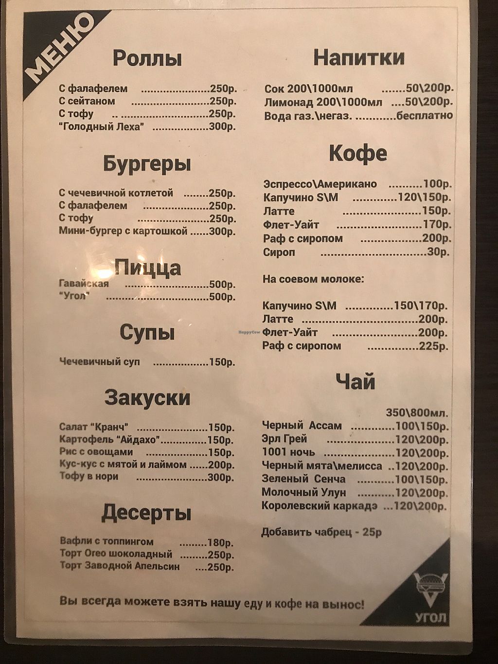 Cafe offering vegan burgers and pizza, falafel, and waffles. Reported fully vegan August 2017, no longer offers dairy milk for drinks. Opened Feb 2017 in the city center. Instagram @ugolxmsk. Confirmed closed, Nov 2019.