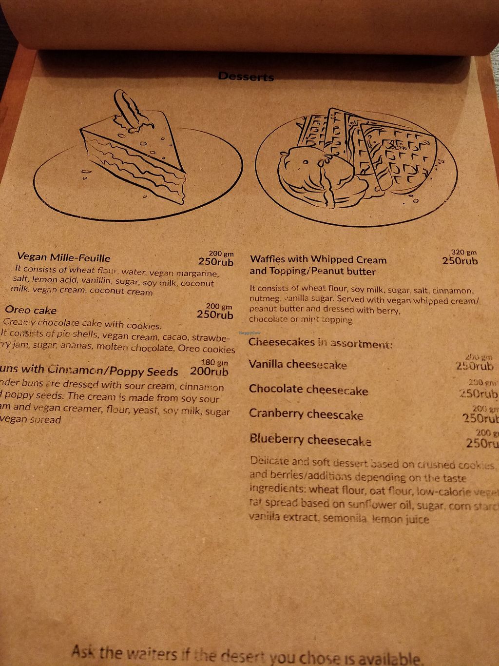 Great place, good menu, menu can be found in English. We tried the cheese, onion and potato soup to start which was lovely! Followed by one of the best vegan falafel wraps I’ve ever had in my life! My partner had the burger which was great also. They do hot drinks and I think cold drinks also. We tried the waffles with vegan cream and chocolate sauce which was lovely. The waffles came out really warm and were nice and soft in the middle. They do a lovely foamy coffee. It’s really well priced, the food is delicious, and it’s the perfect place to escape a Russian winter and warm up for a bit! This was one of our favourite vegan places in Moscow, definitely worth a visit!