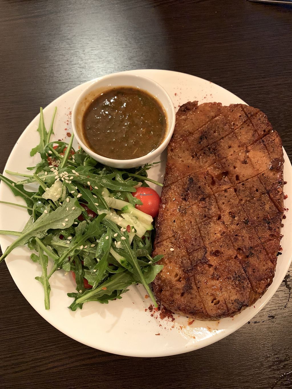 we were delighted to find this place close by the pushkin museum/kremlin. big portions, great options, tasty hand made vegan food to the rescue! would love to try more from the menu but we had: tofu nori rolls, the seitan steak and salad and the black bun seitan burger. with a pitcher of fresh sparkling mint/cucumber limeade! the seitan steak was like one of this mythical slabs of christmas ham: platter sized and 3/4” thick. well, not mythical. sadly people actually eat chunks of animal flesh that size and greater. give this vegan a try! 🌱