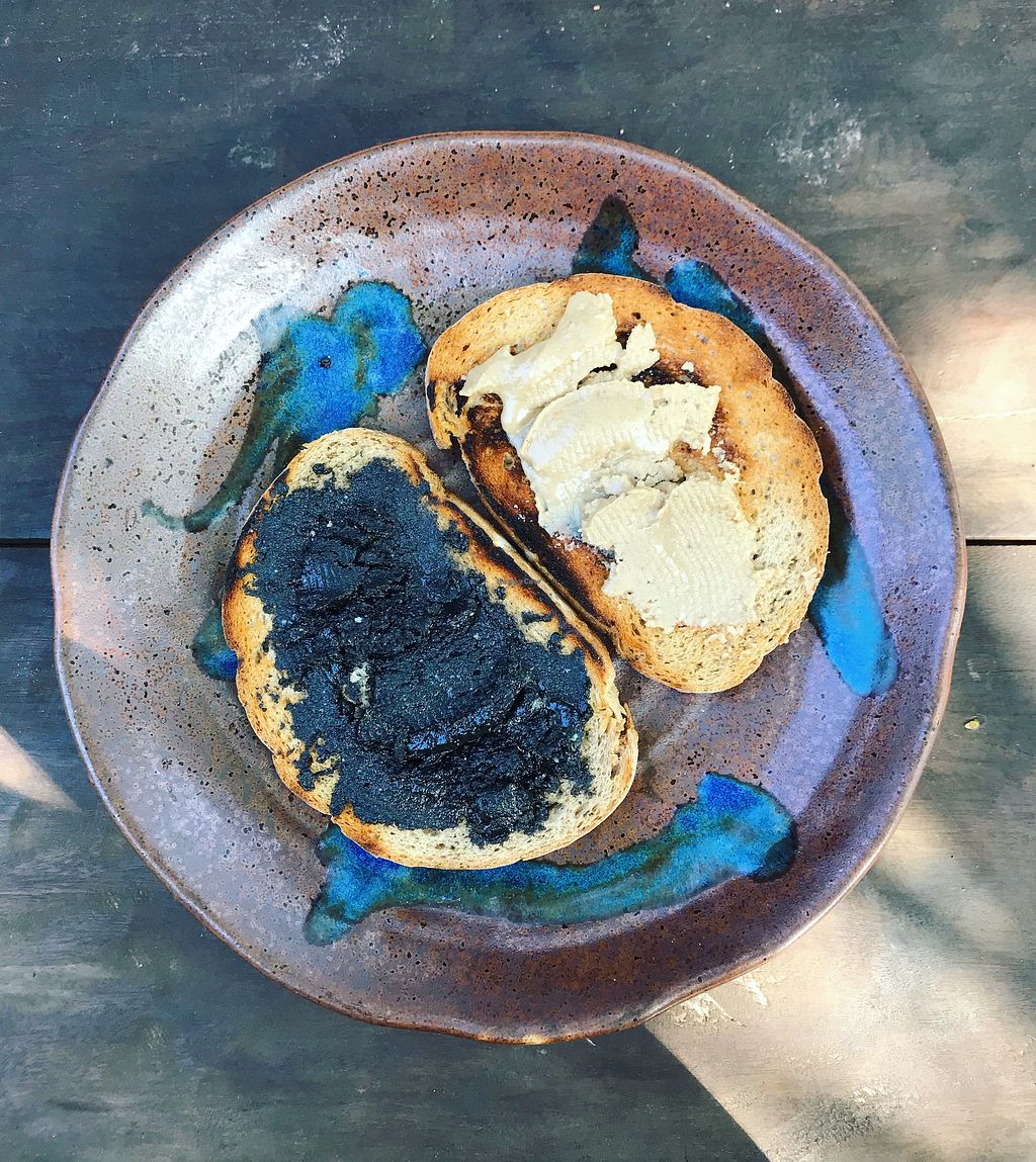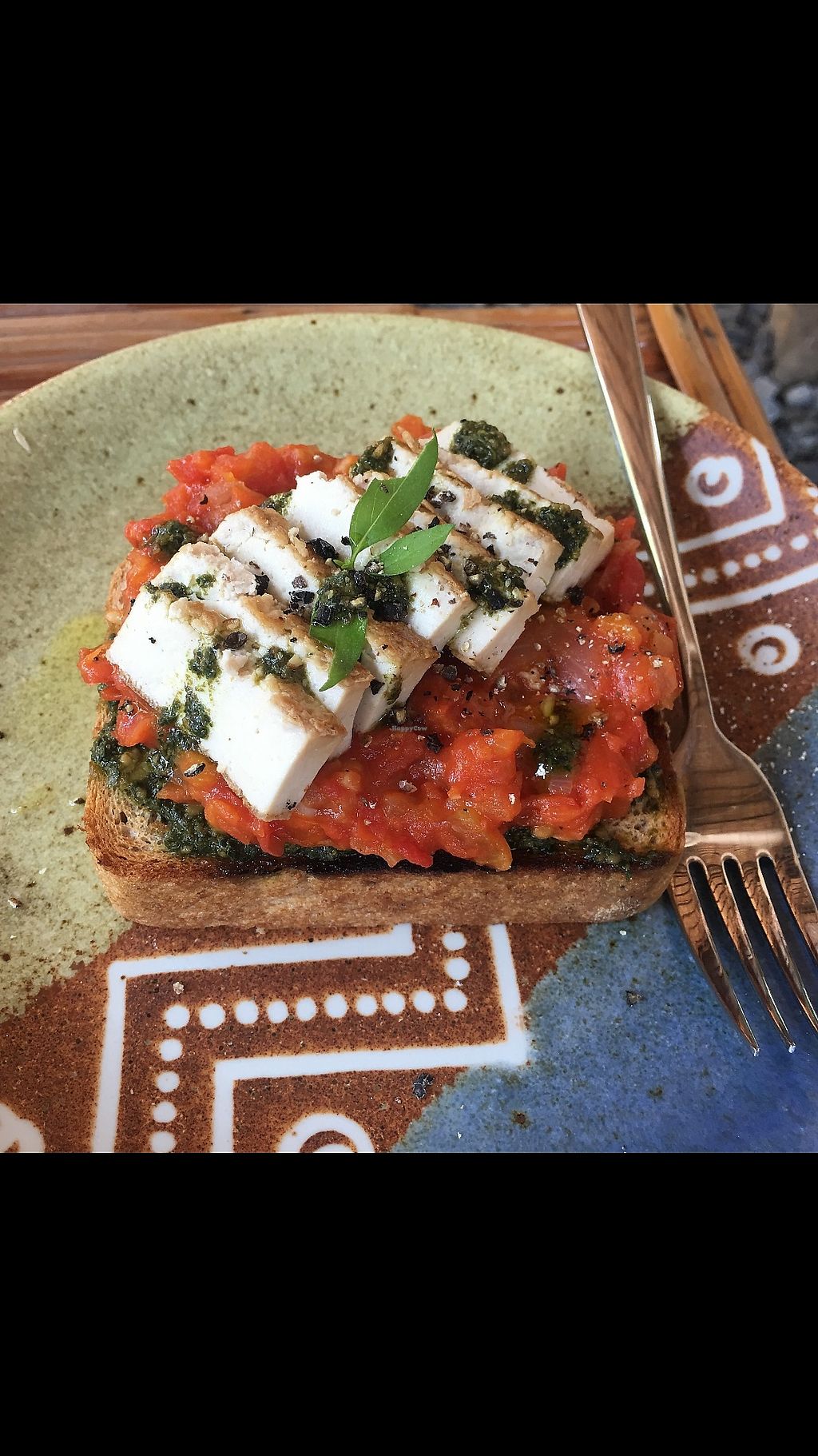 Pizza toast with fermented pesto, tofu cheese, and homemade tomato sau…