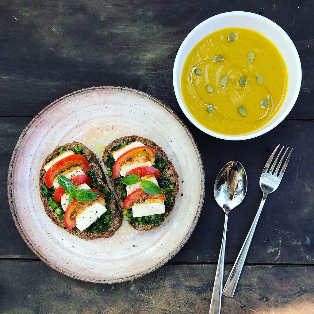 Caprese on Toasted Brown Bread and Whole Pumpkin Soup.