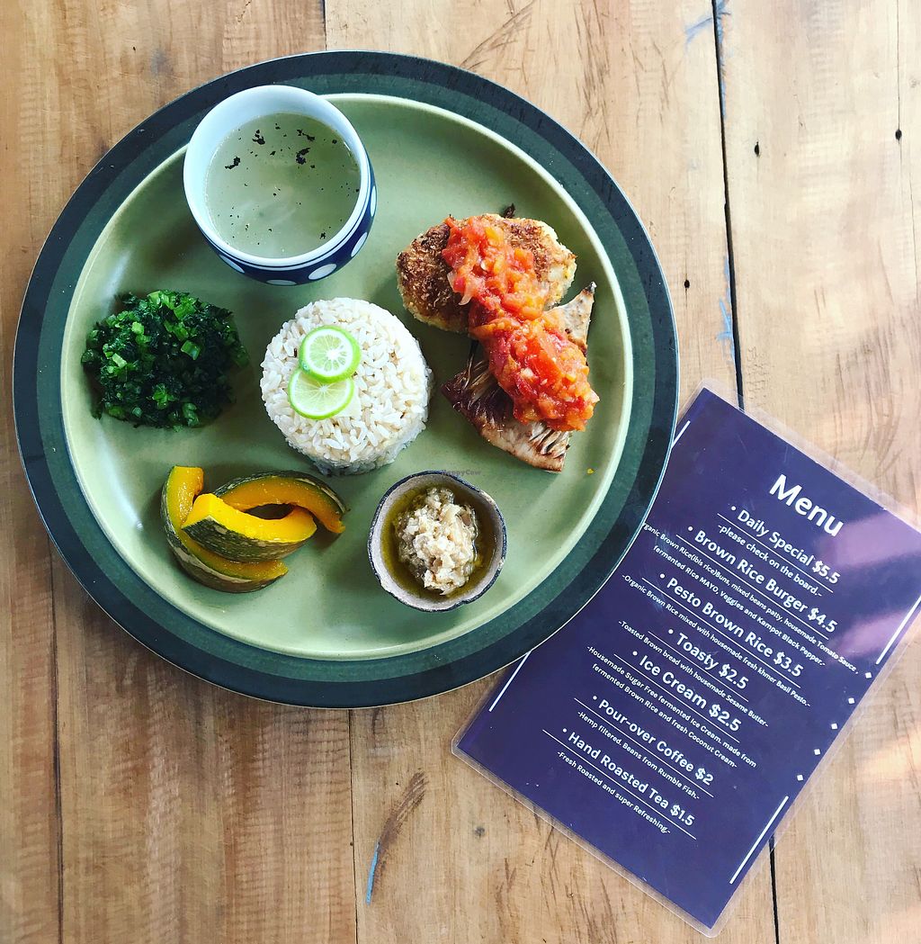 Daily special. Amazing flavors. Papaya salad, curry okra, grilled jala…
