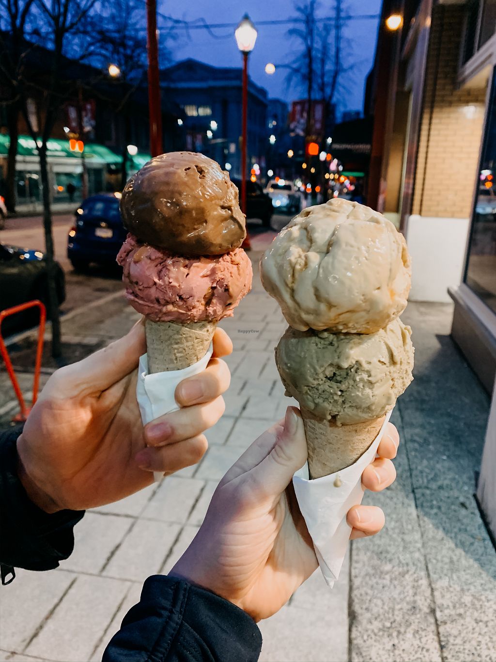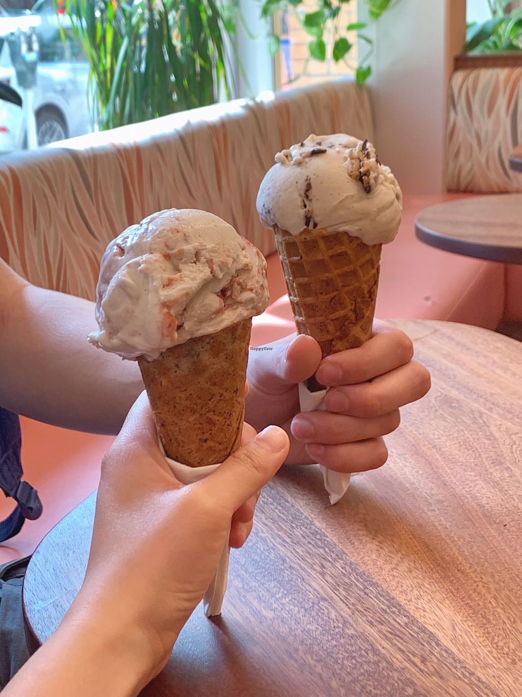 Stopped here with my mom after visiting chomp eatery and got two scoops of a waffle caramel flavour and the lavender dreams flavour on a gluten free waffle cone! It was one of the creamiest vegan ice creams I have had! The staff was also super friendly😄