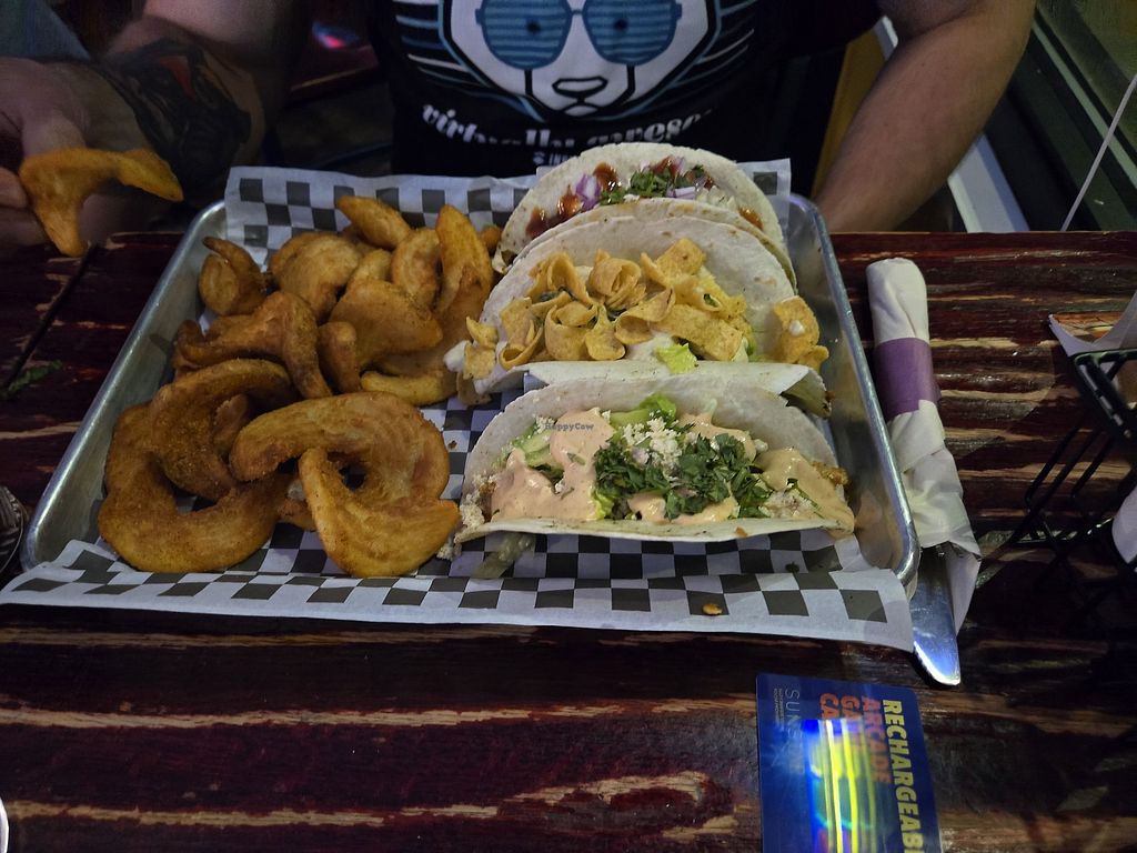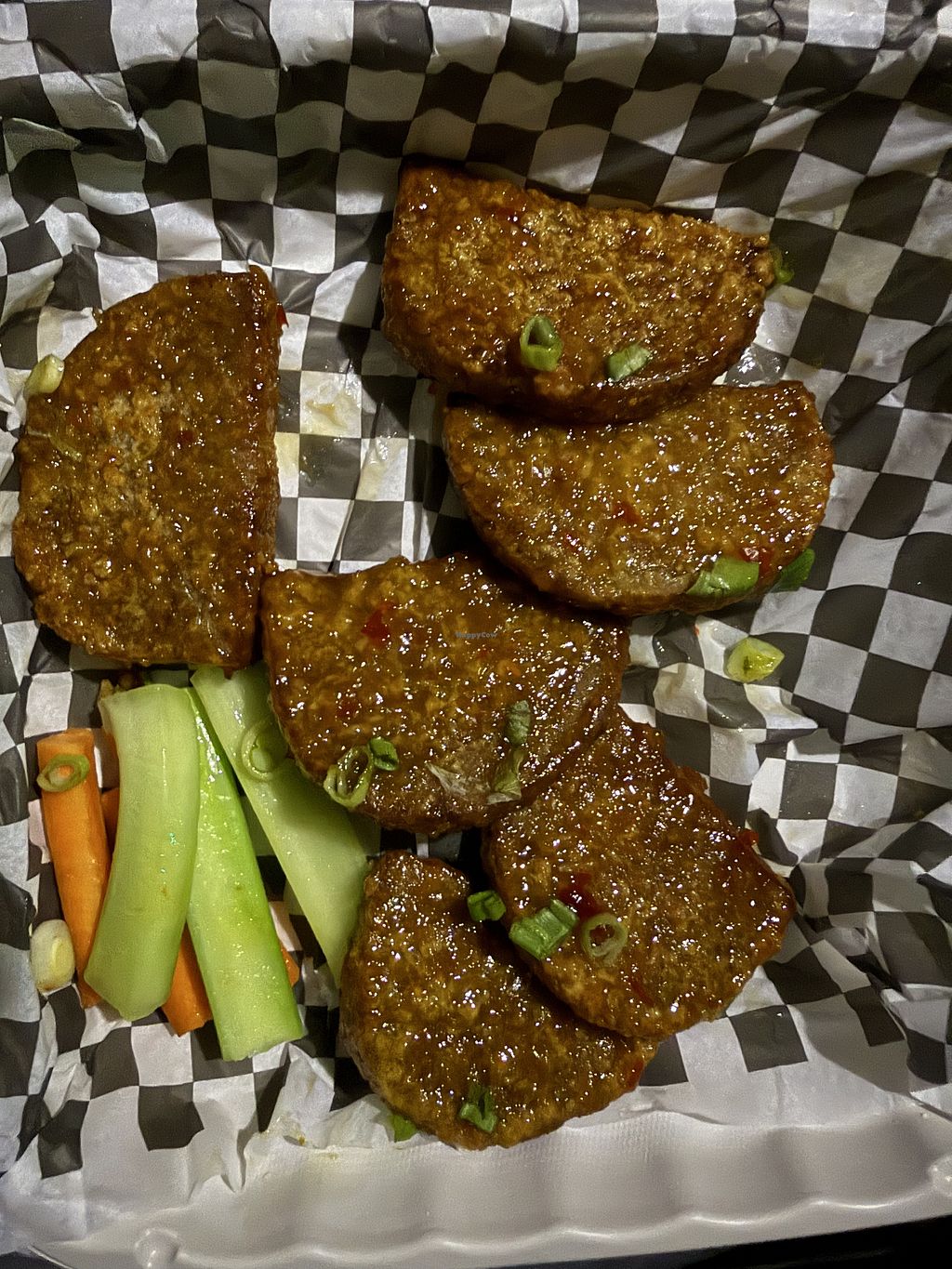 Three-way seitan wings (buffalo, barbecue, and garlic park COMBINED)