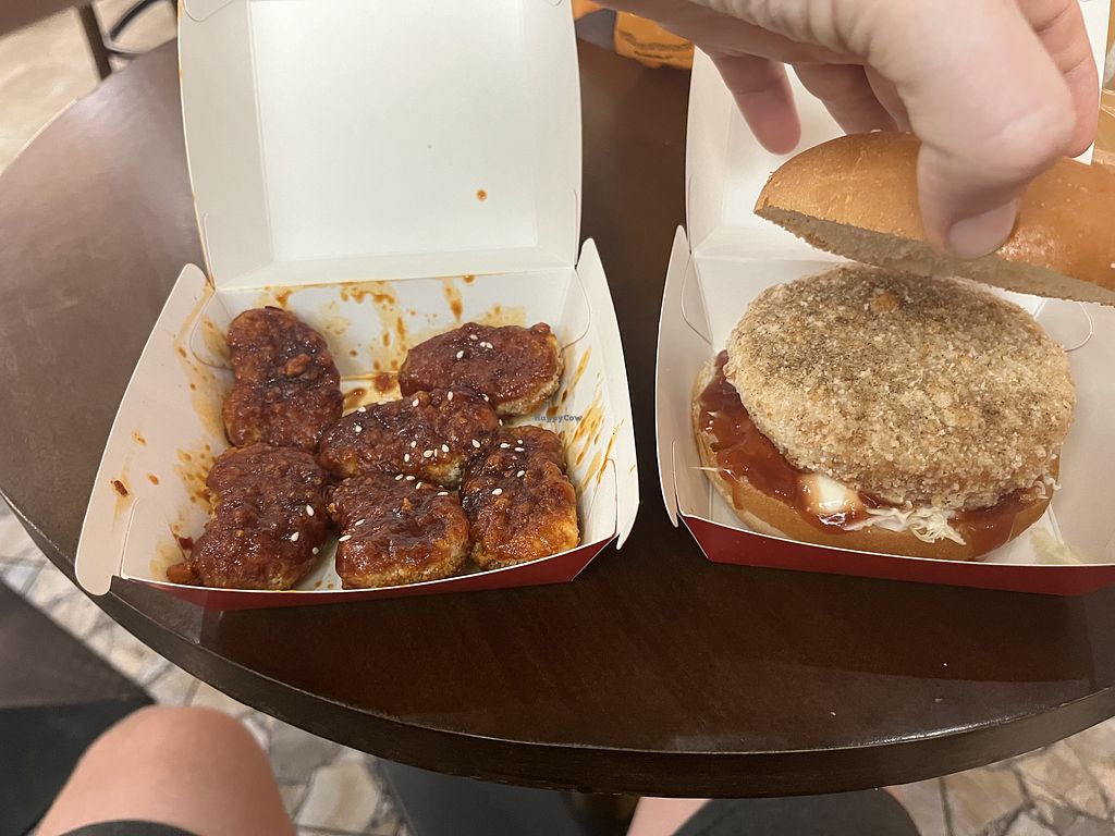 Serves meat, vegan options available. Fried chicken chain with a stall located in the food court of Imago mall. Offers vegan (labeled as plant-based) chicken nuggets, fried chicken and a burger. Open Mon-Sun 10:00am-8:00pm.