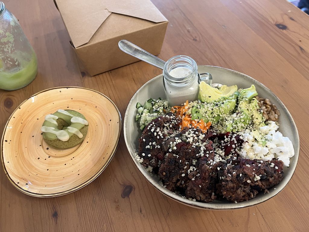 fully vegan and very delicious! great smoothies, juices, bowls, and food. also some empanadas and baked goods including a cbd chocolate chip cookie😄