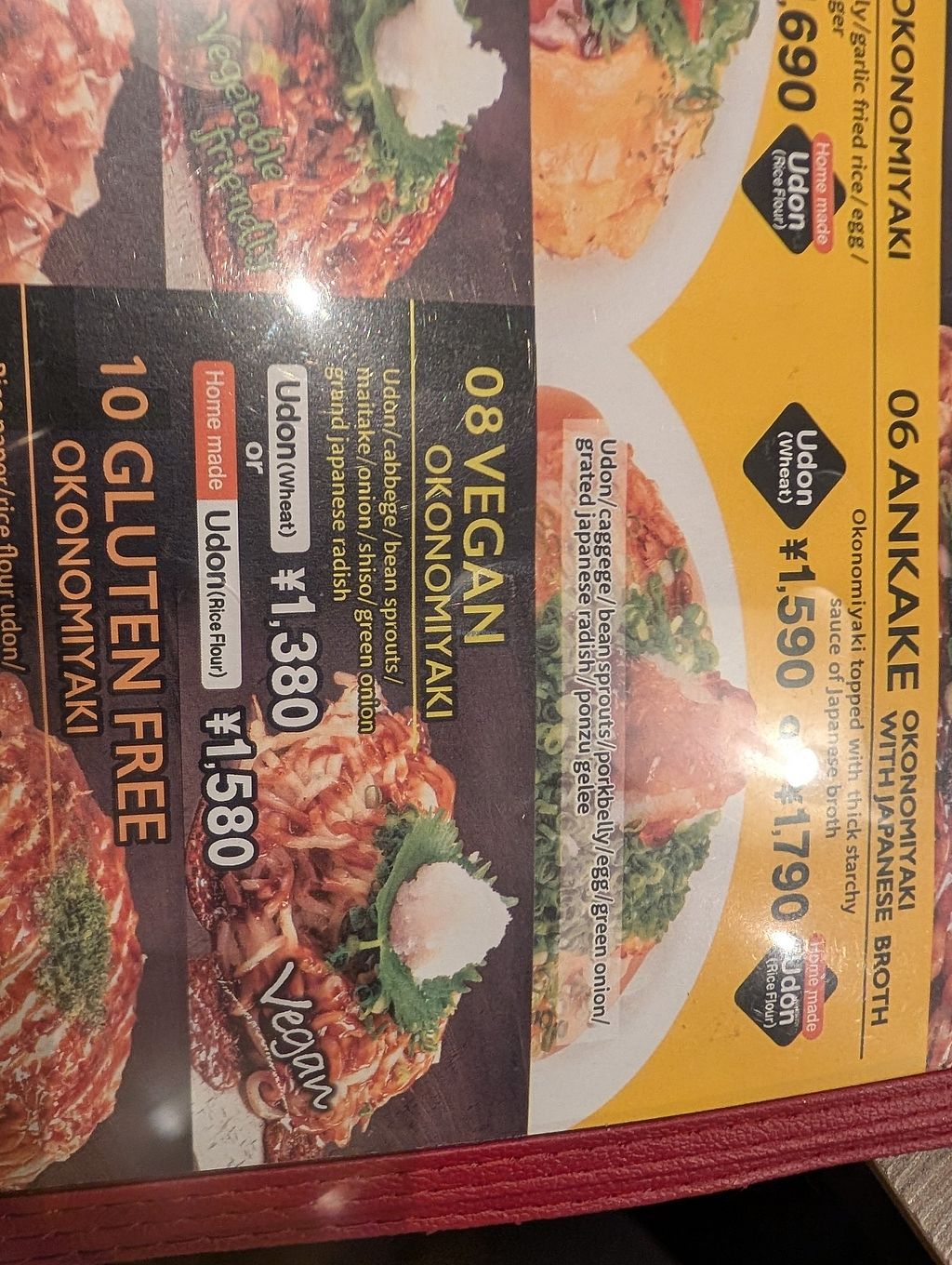 I had attempted to visit another Okonomiyaki restaurant but the line was way too long for me and I was hangry and this place had caught my eye while on the way from the big "vegan" and "vegetarian" signs they had hanging outside their location, so I decided to go back and give that place a try. I am glad I did because it was great! The menu is clearly labeled with vegan & vegetarian options both within their regular menu, as then there is a page dedicated to those options as well so it's easy to determine what you can and cannot have as they list what is in it within the menu.