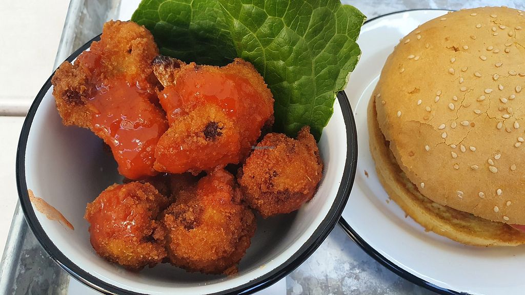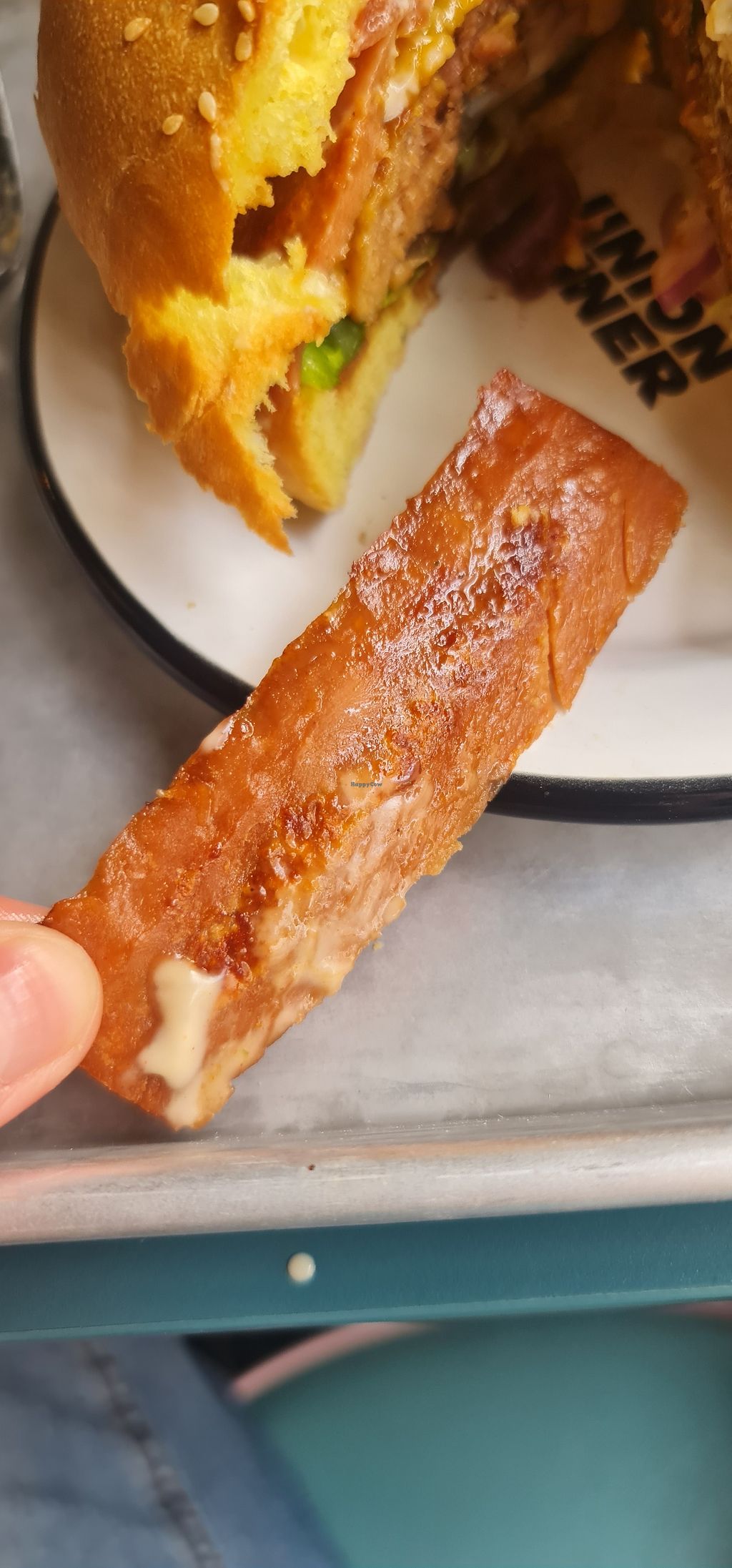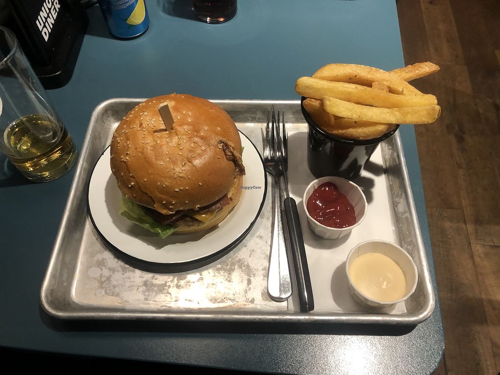 Clean Harry w vegan patty, tofu bacon, tomato, onion & vegan chedar!