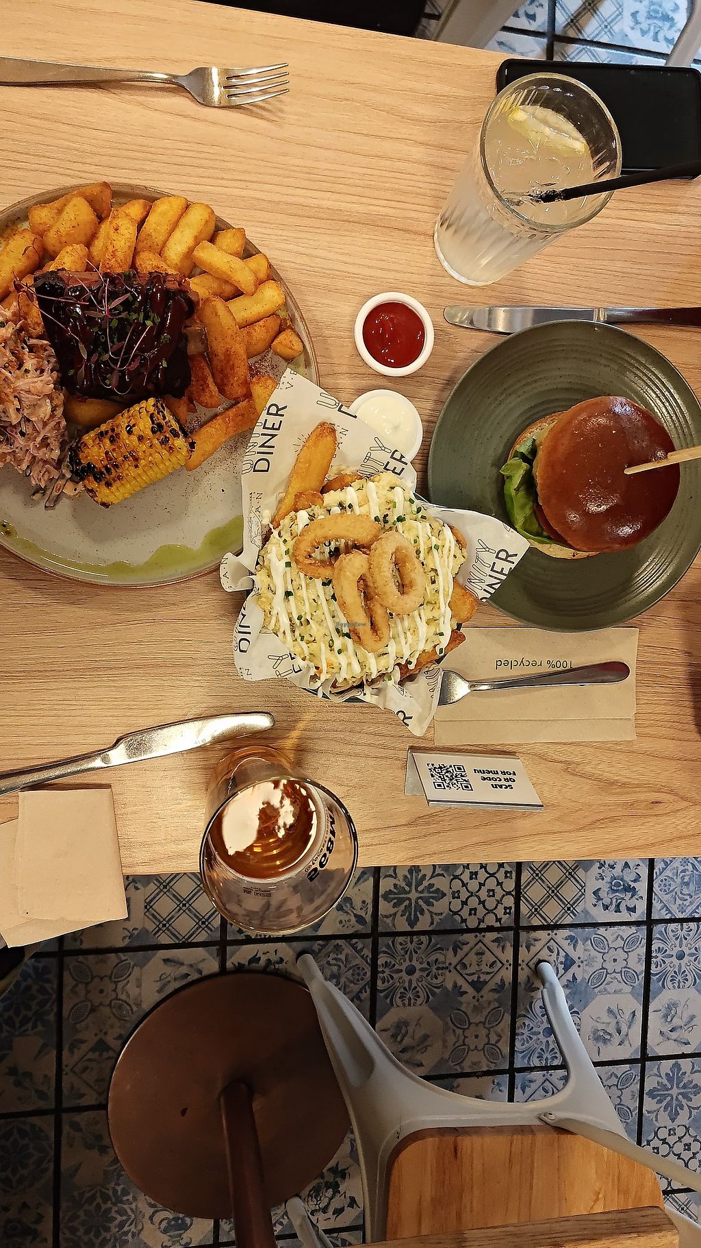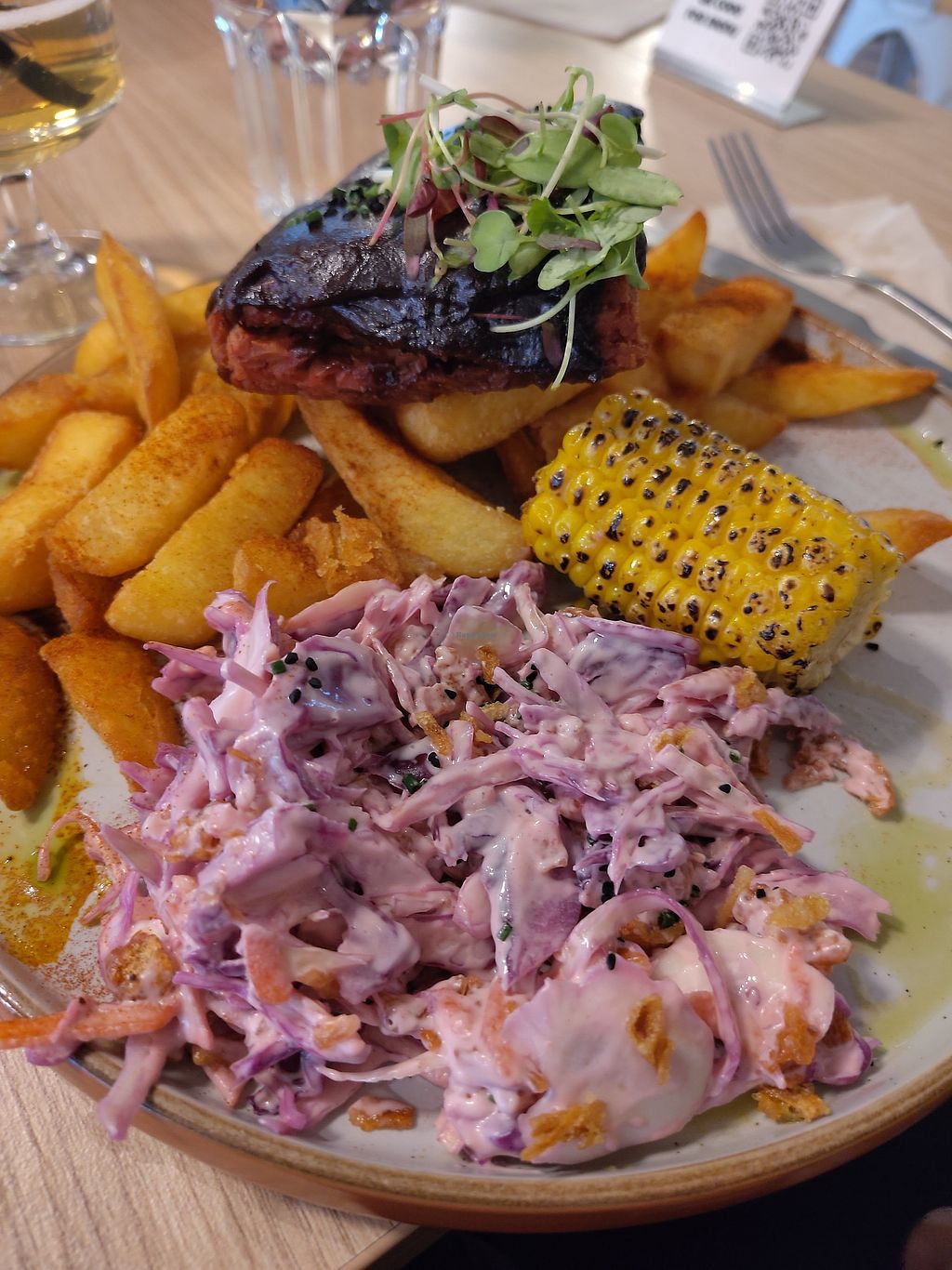 - Bei den Rips waren einfach viel mehr Beilagen als alles andere. Es waren 3 kleine 'Fleisch'- Stücke dran und dann gefühlt dazu 300g Pommes, ein bisschen Cawlslaw und ein kleiner Maiskolben.