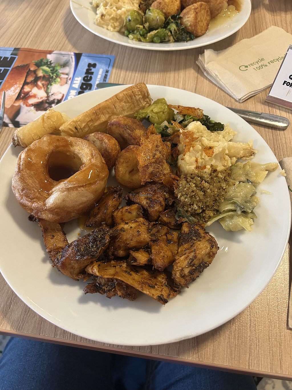 The second evening we were there for the Sunday Carvery. Everything tasted great. We even got to try all three meats (chicken; turkey and lamb). Texture wise the turkey and lamb were quite similar; one in brown sauce, the other in lighter sauce. The chicken tasted like vegan chicken bites you can buy at the store and make at home.