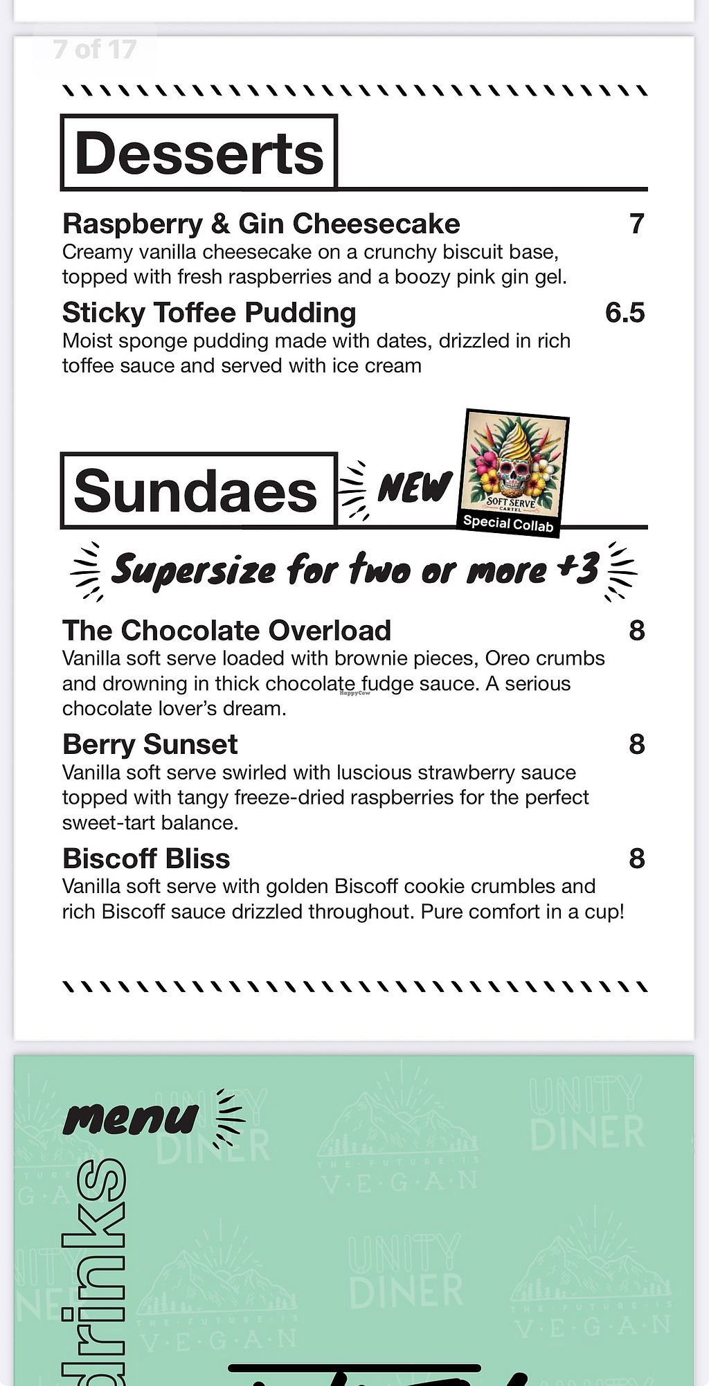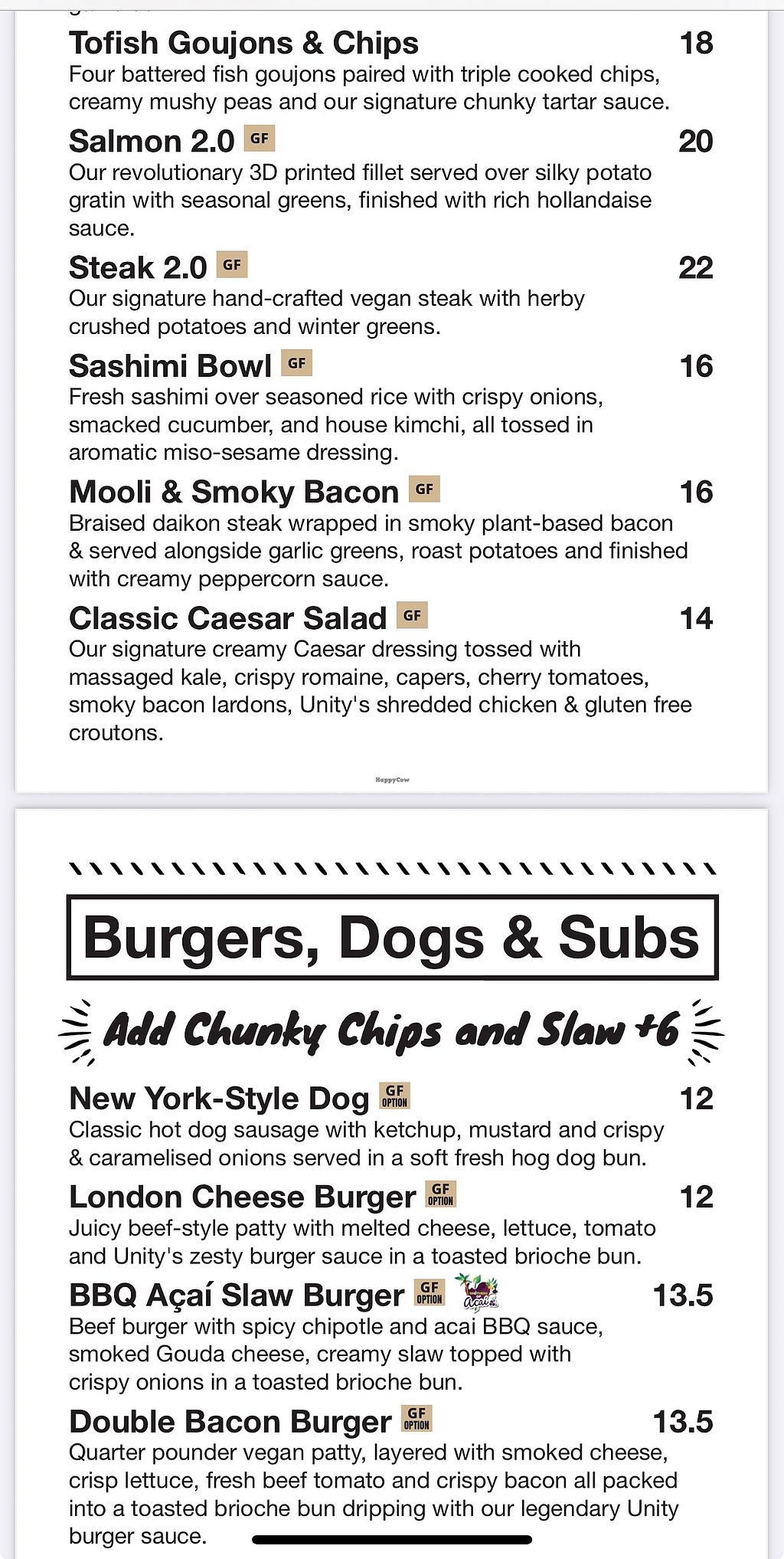 I visited unity diner on a Sunday and a non-sunday. On the regular, non-sunday, menu, there are so many options to choose from. The tofish bites were incredible. I had the steak 2.0 as well, but it wasn't quite as good as the tofu. The biscoff Sundae was delicious.