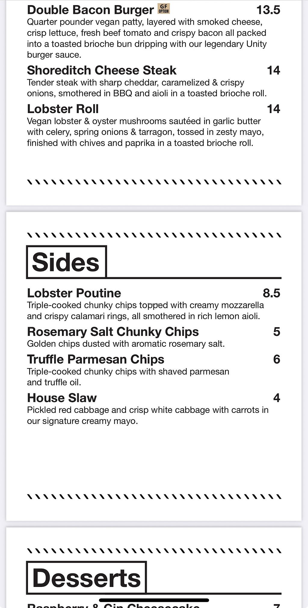 The food was ok, nothing special, my main was lukewarm and I had to send it back. They did actually re make my food rather than reheat it, which was nice!! But what was really disappointing was the waitress and other staff just looked so bored and disinterested, not a welcome or a smile. Everything just seemed like it was too much trouble. The bill was £146 for 3 of us without desserts. I was shocked, I suppose this is normal for London, but imo it wasn't worth it. As I said, nothing special and definitely won't waste my time or money there again. What a shame as the old Unity Diner was lovely.