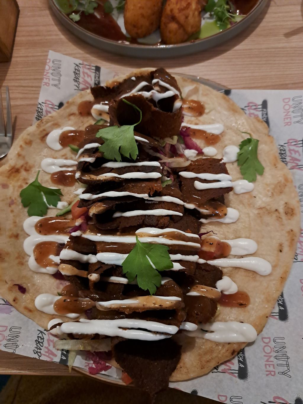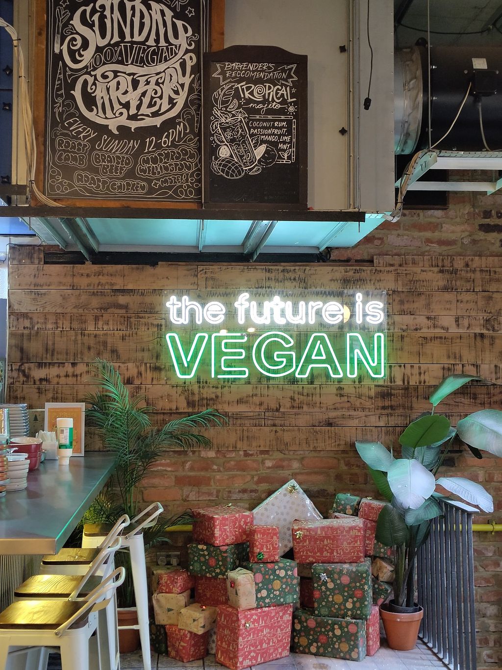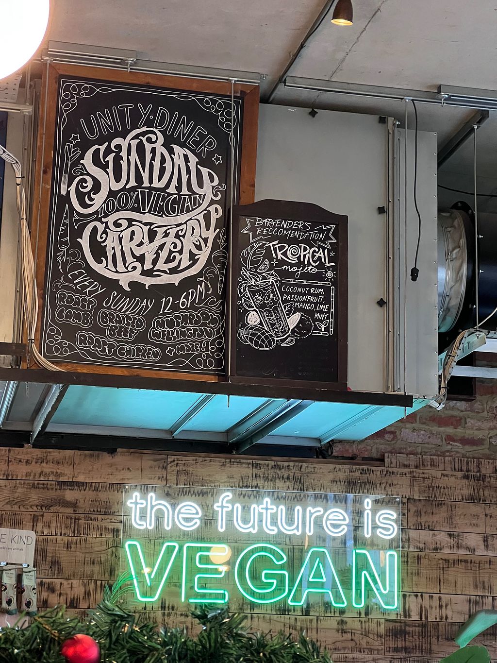 A Happy Cow find strikes gold again. Wonderful vegan food at Unity Diner. Quiet Friday lunchtime, Doner loaded fries, and a bacon cheese burger. Cool interior - a glowing sign saying ‘The Future is Vegan’; I wholeheartedly hope & agree.