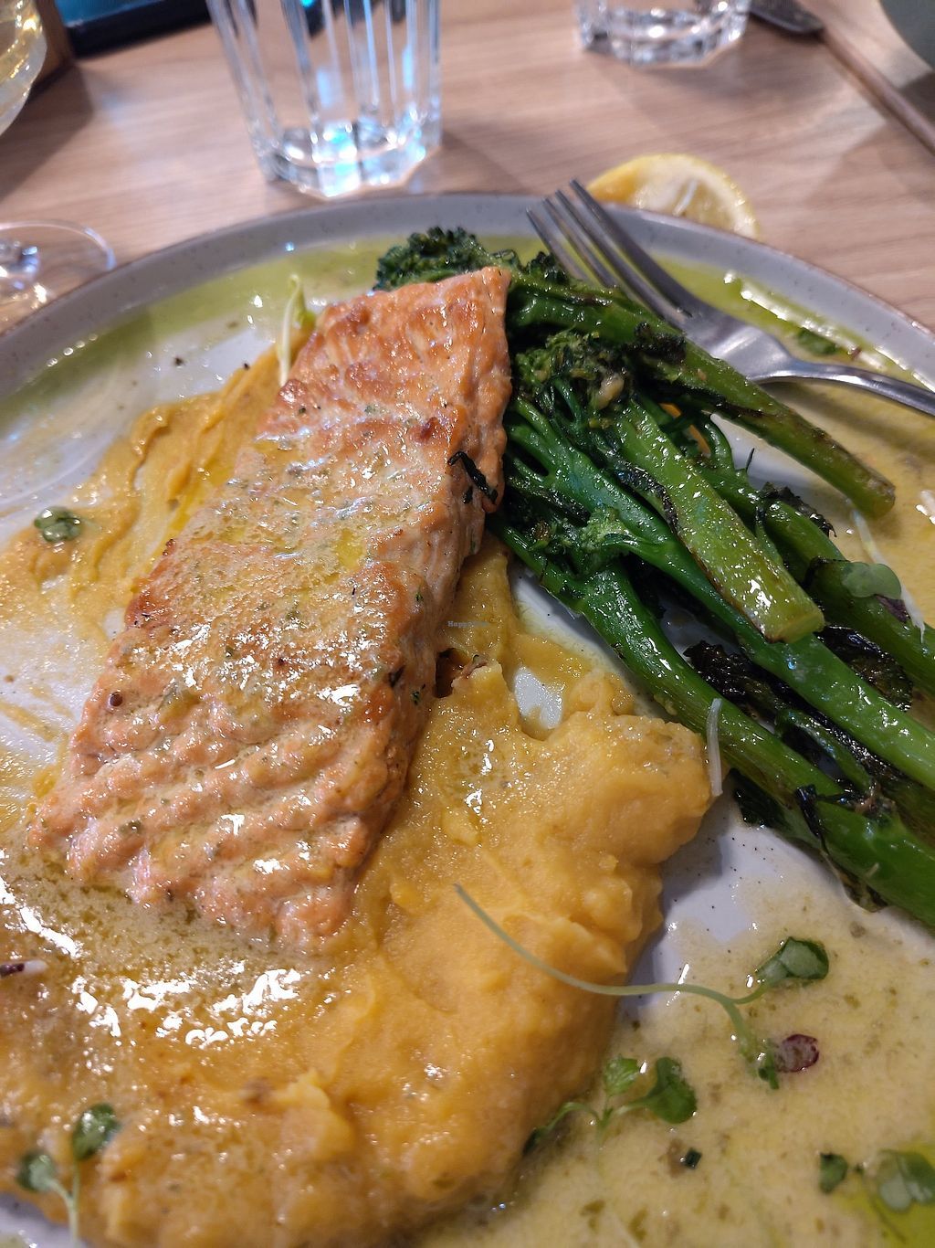 I’ve been twice to the Sunday carvery, most recently the “festive” pre-Xmas one. You can go back for more of the side dishes, gravy and condiments and choose one of the mains (several choices) and one Yorkshire pudding (GF option available). I liked most of the dishes; a few were less tasty than others. All good food. Set price, with included gratuity.