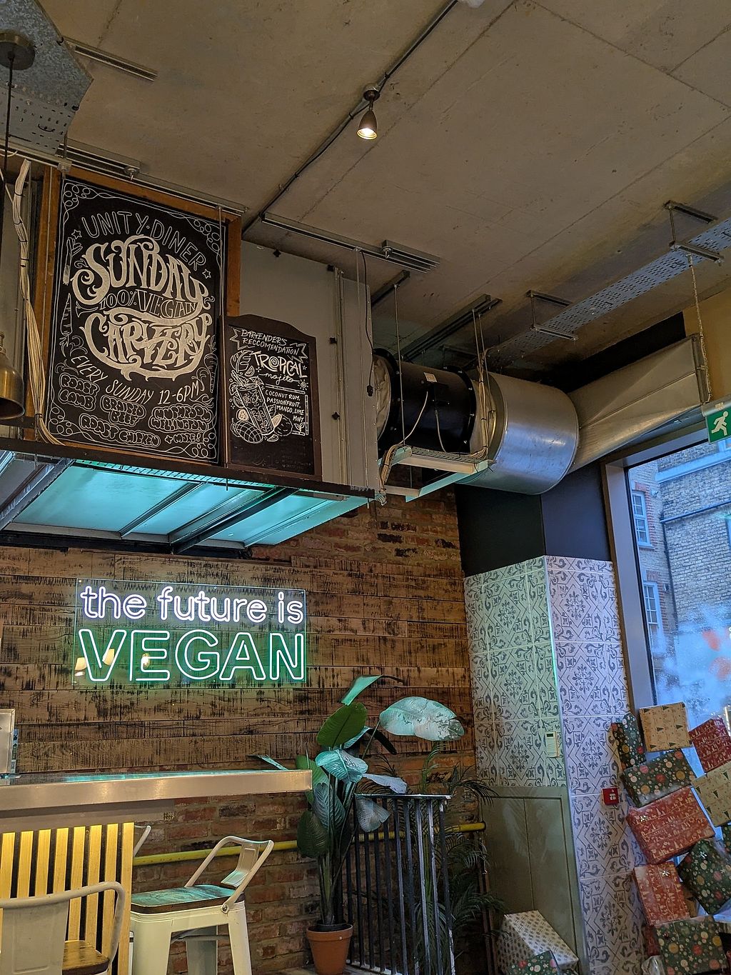 A Happy Cow find strikes gold again. Wonderful vegan food at Unity Diner. Quiet Friday lunchtime, Doner loaded fries, and a bacon cheese burger. Cool interior - a glowing sign saying ‘The Future is Vegan’; I wholeheartedly hope & agree.
