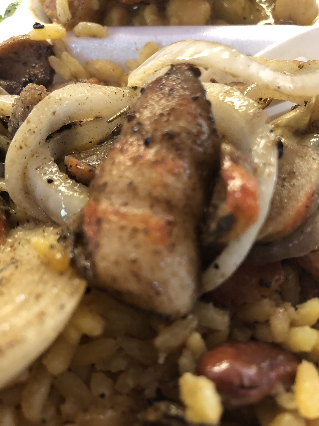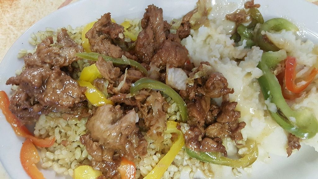 This was the lemon chicken, spanish rice, black eye peas, and trinity …