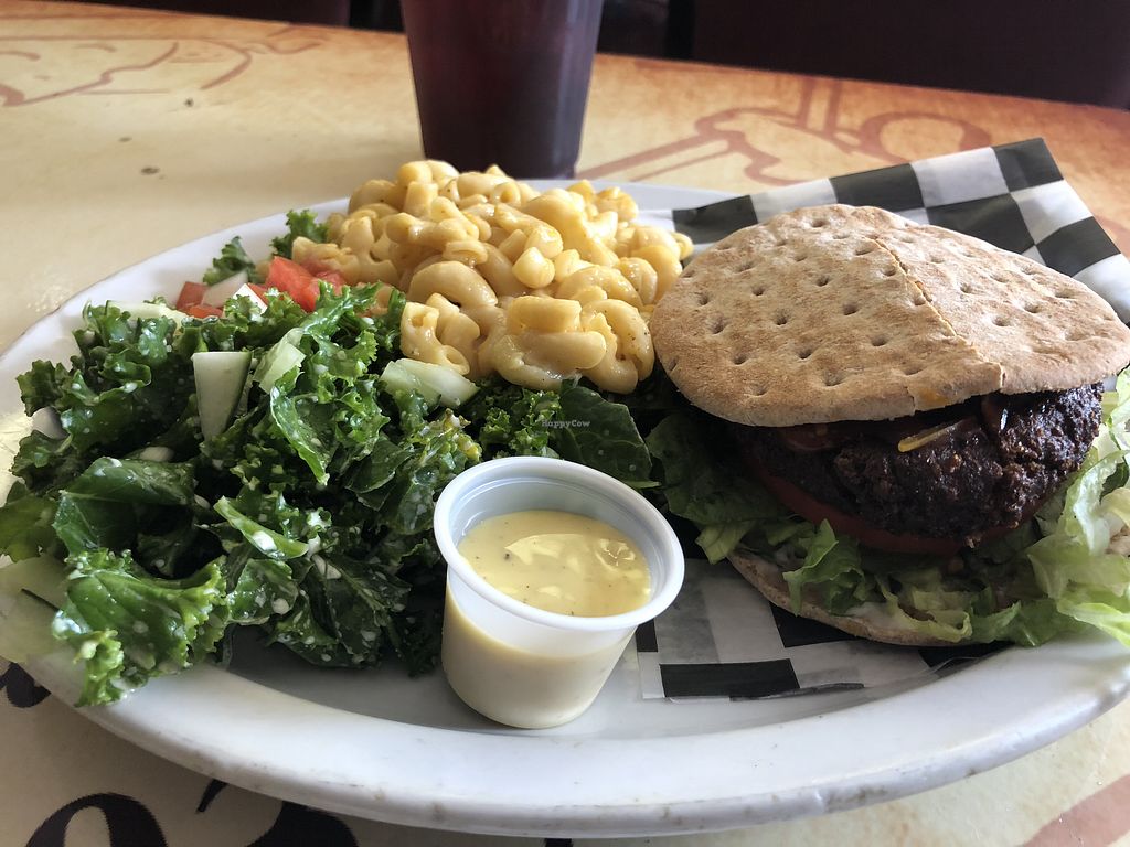 Good Burger, mac no cheese and kale salad