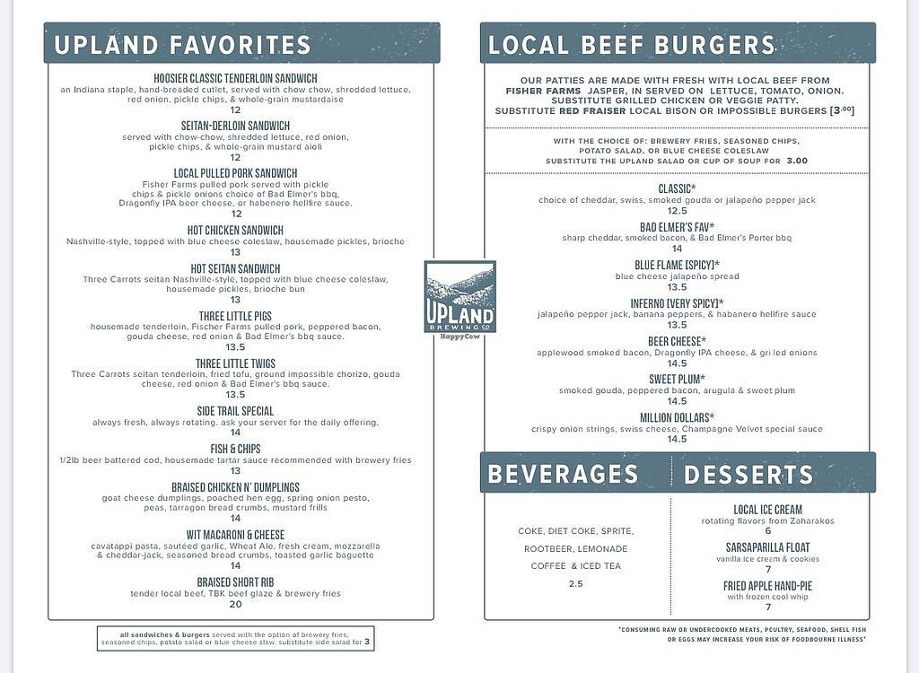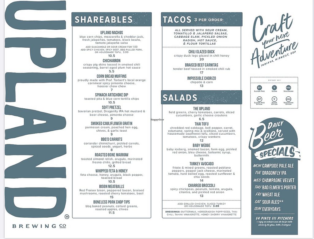 Check here for updated listing, we check with them seasonally for updates: http://www.bloomingveg.org/places/restaurants/upland-brewing-co-brewpub/