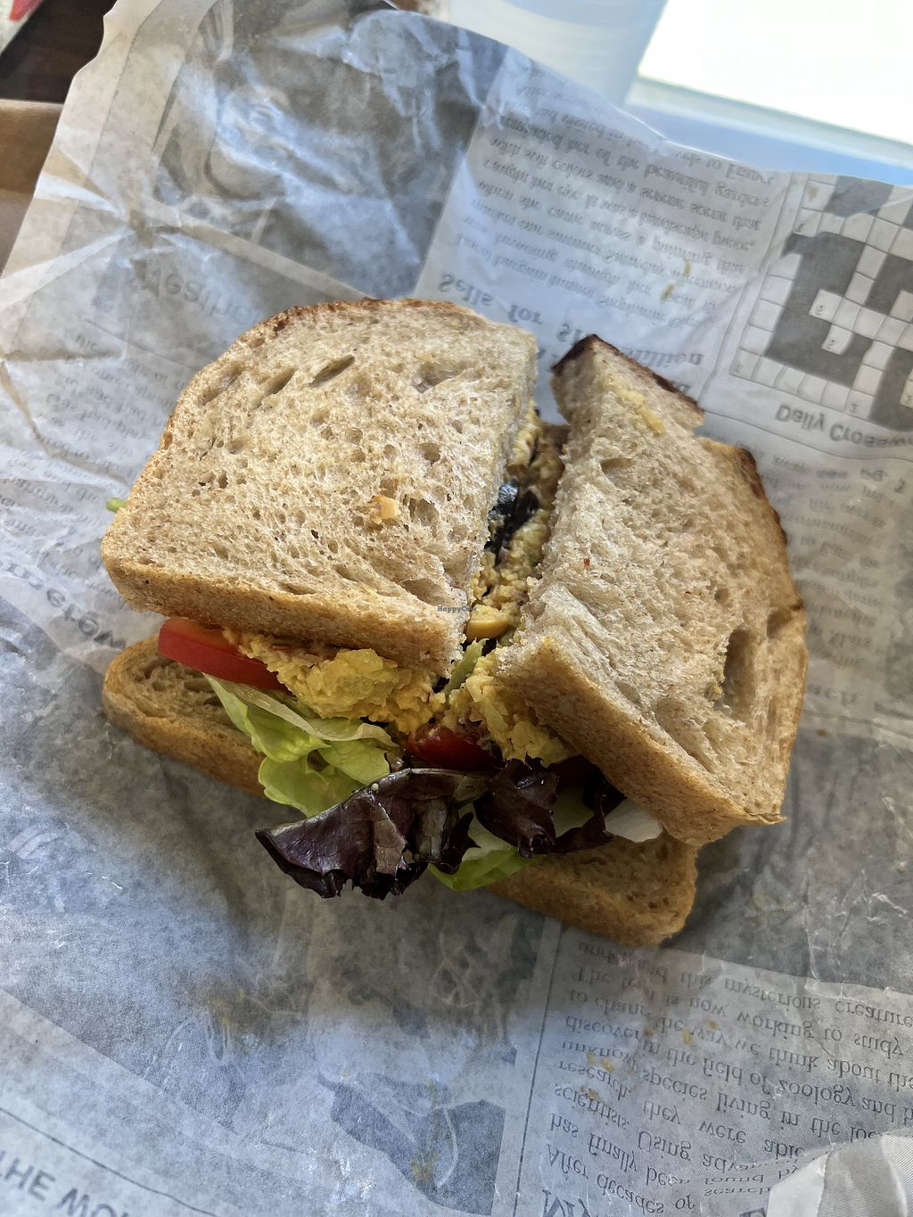 Vegan Chickpea “chicken” salad sandwich on toasted gluten free bread. …