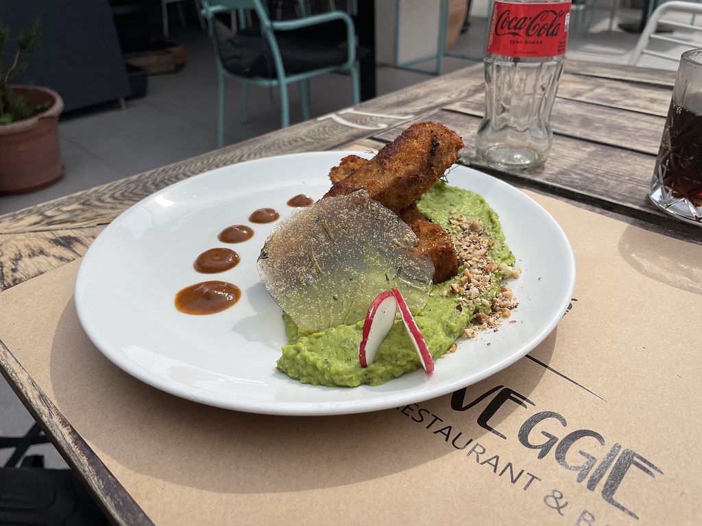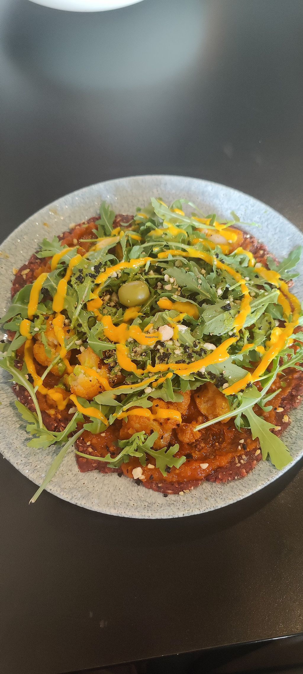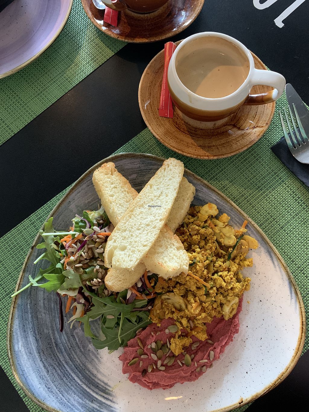 Scramble tofu, focaccia and beetroot hummus, fresh salad.