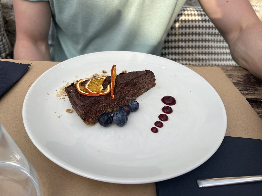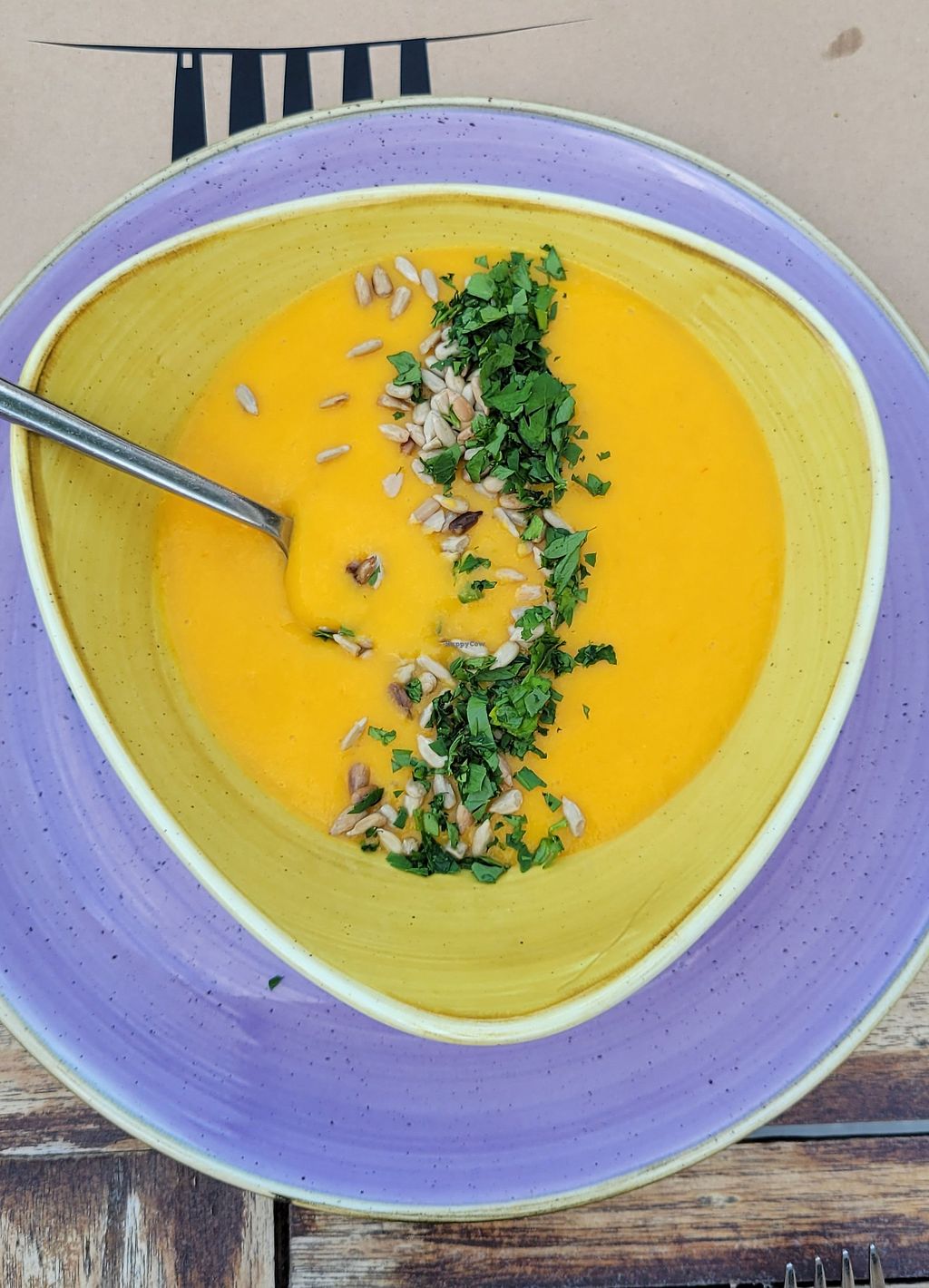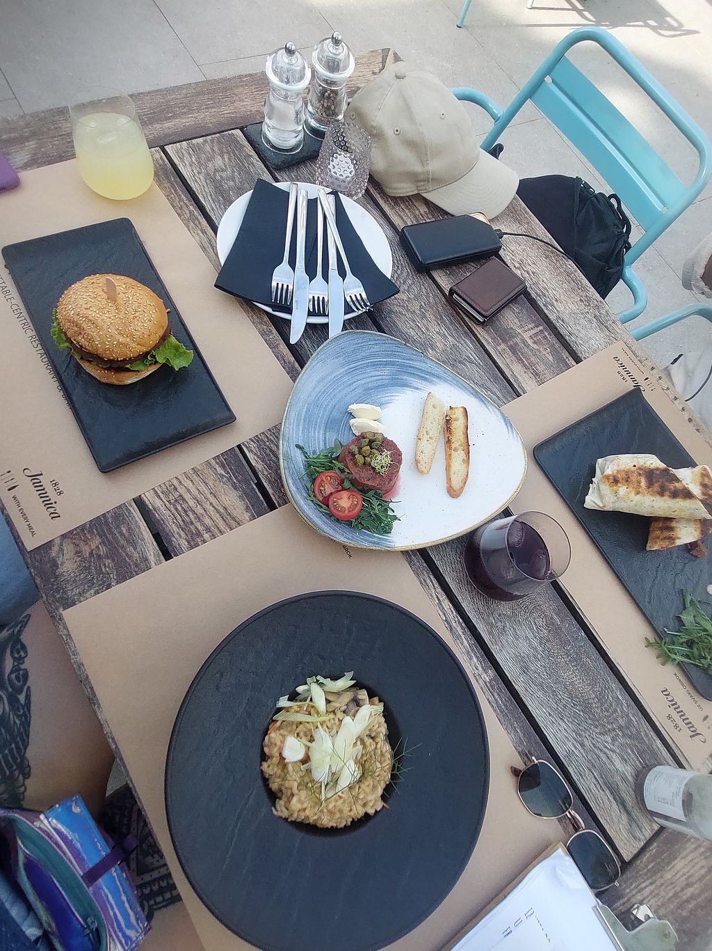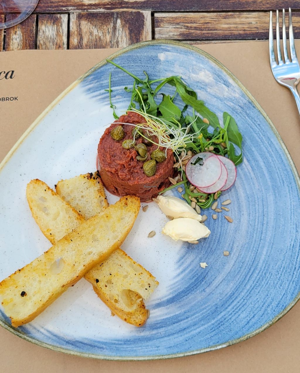 Scramble tofu, focaccia and beetroot hummus, fresh salad.